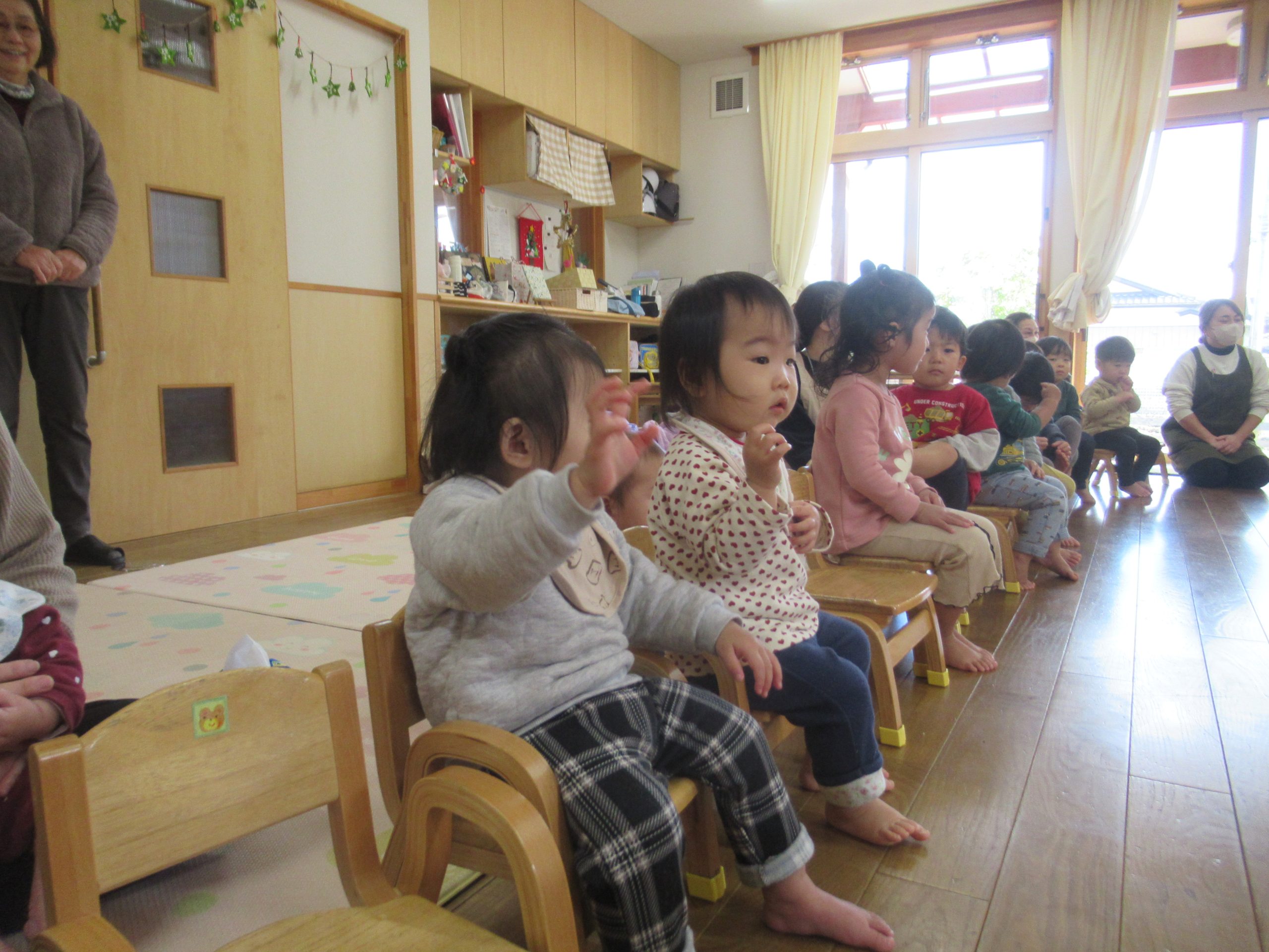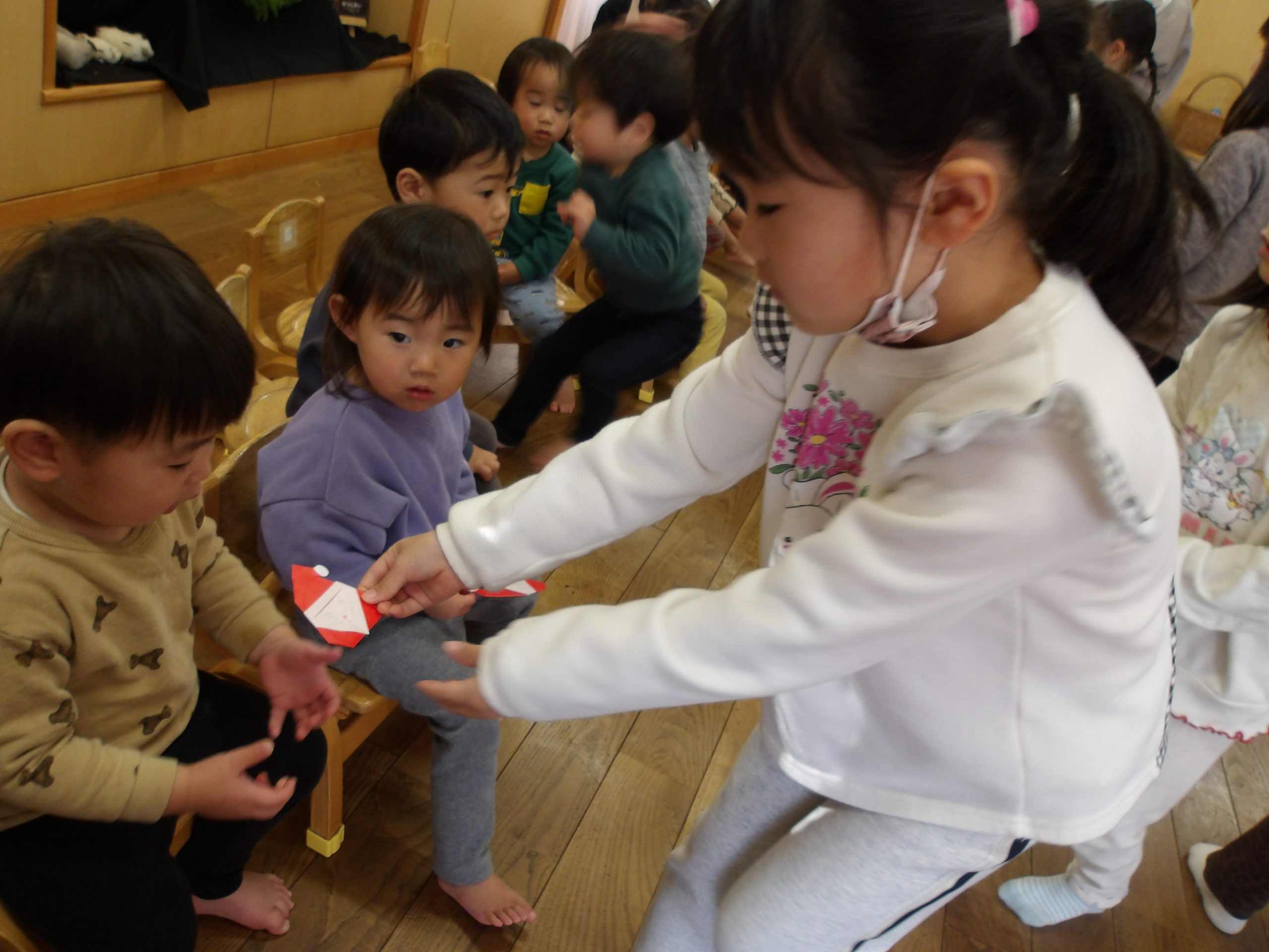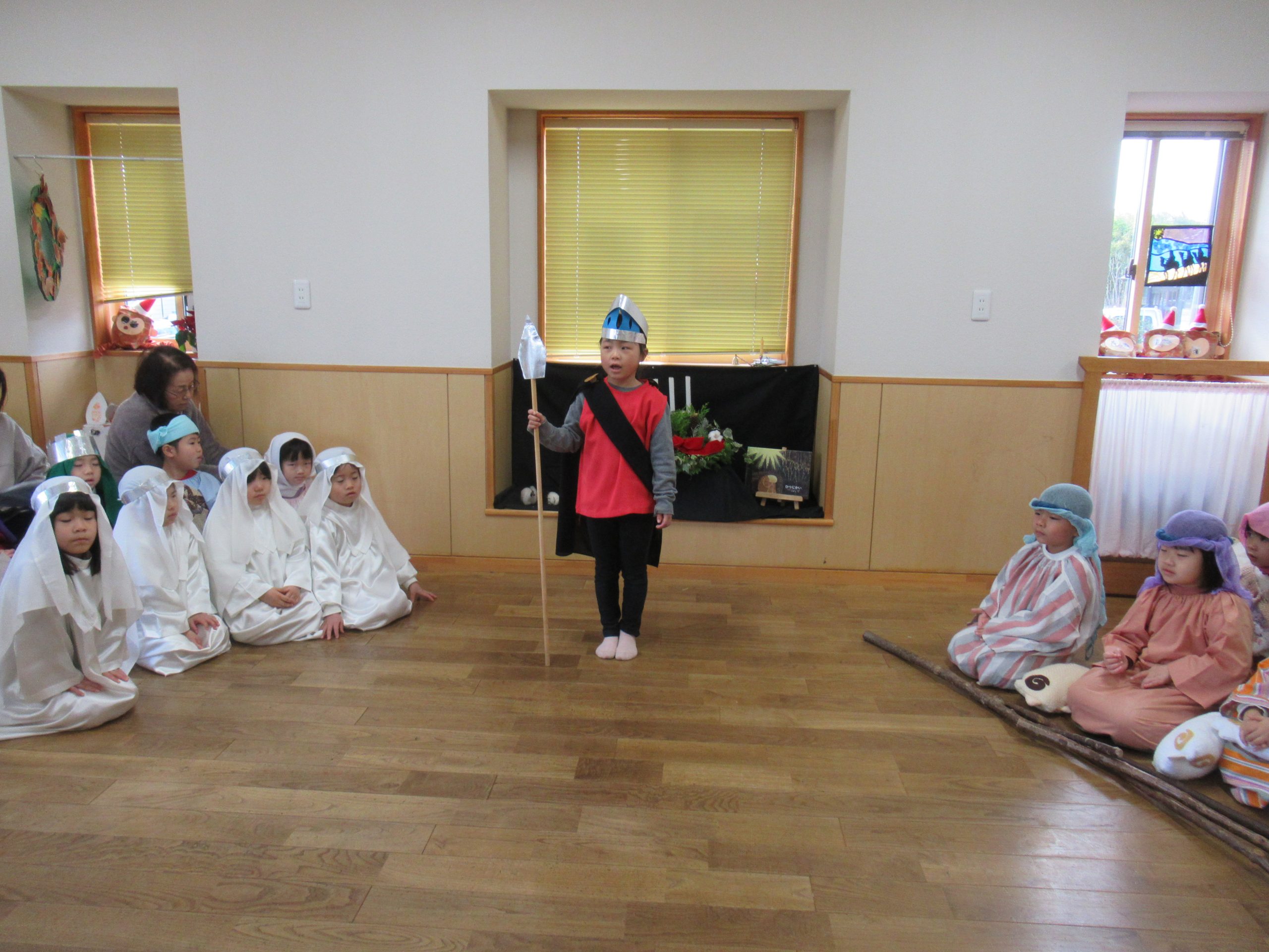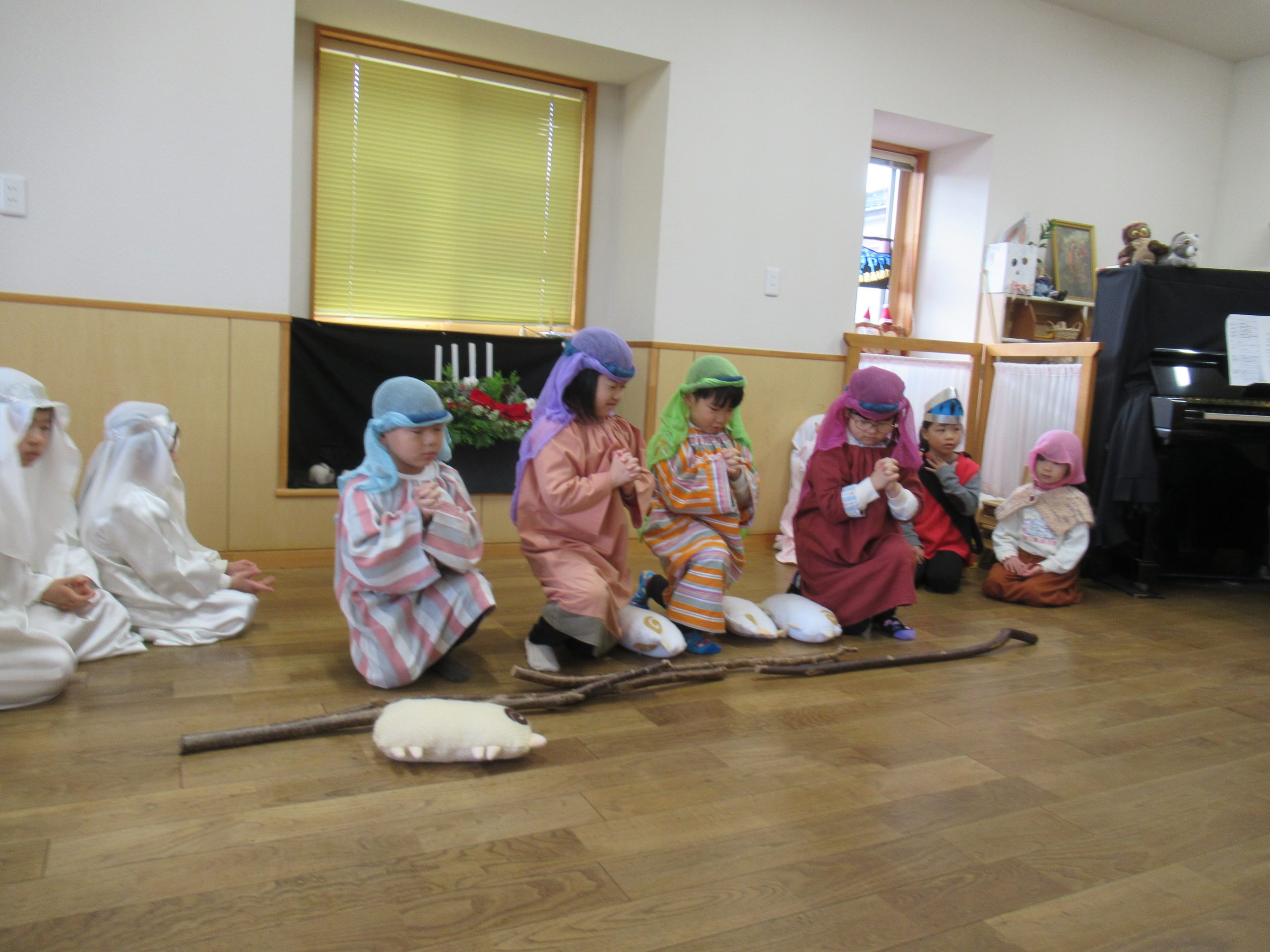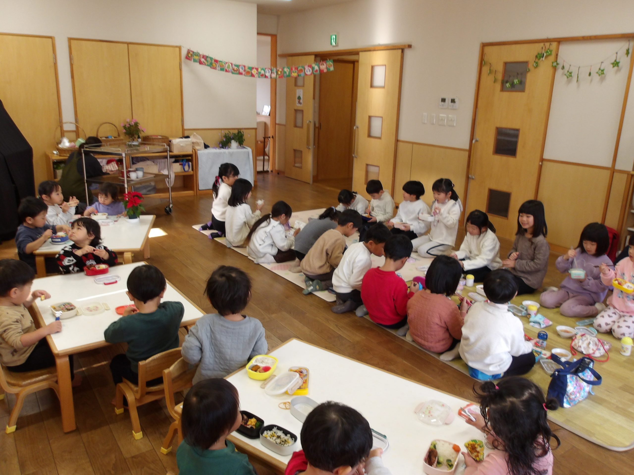 つき組さんと交流のひと時を持ちました。聖誕劇をじっくり見入る子どもたち。きっと“あっ知ってる”と思いながら見ていたことと思います。天使さんの動作に併せて、思わず手を拡げたことり組のRちゃんとEちゃん。最後まで見届けていました。あわてんぼうのサンタクロースを歌ったりプレゼント交換をしたりしてから、昼食(お弁当)を一緒に食べてさよならしました。楽しかった!つき組さんありがとう。