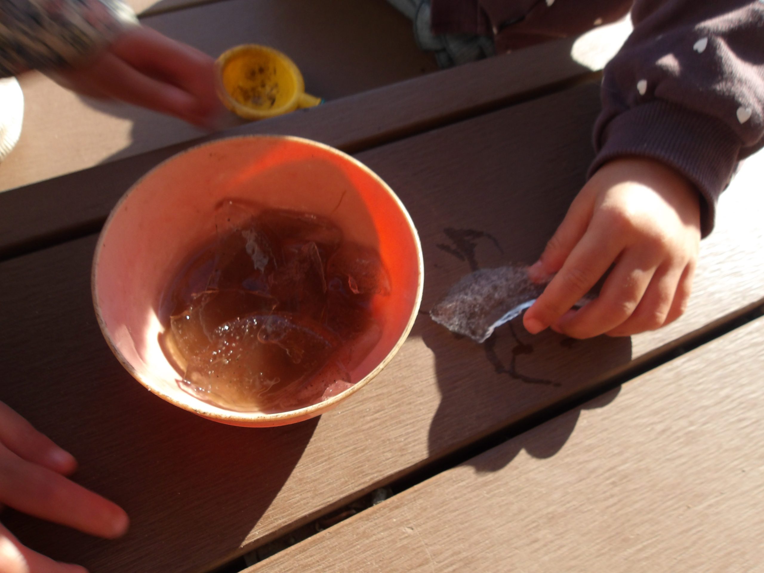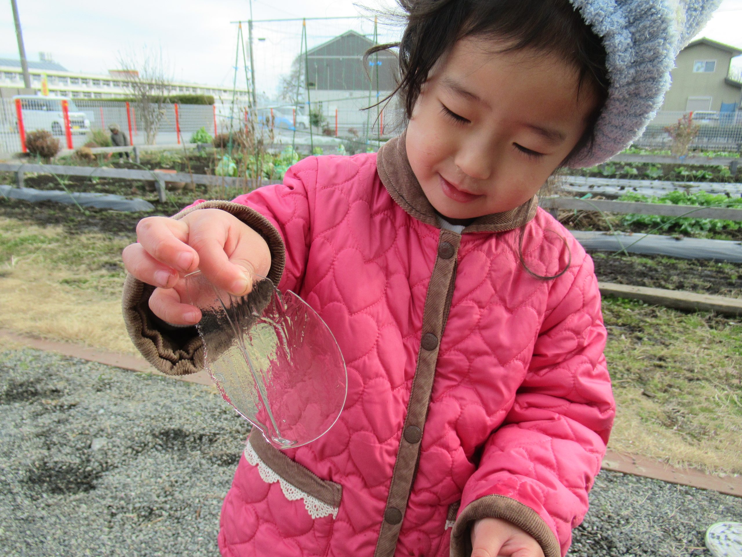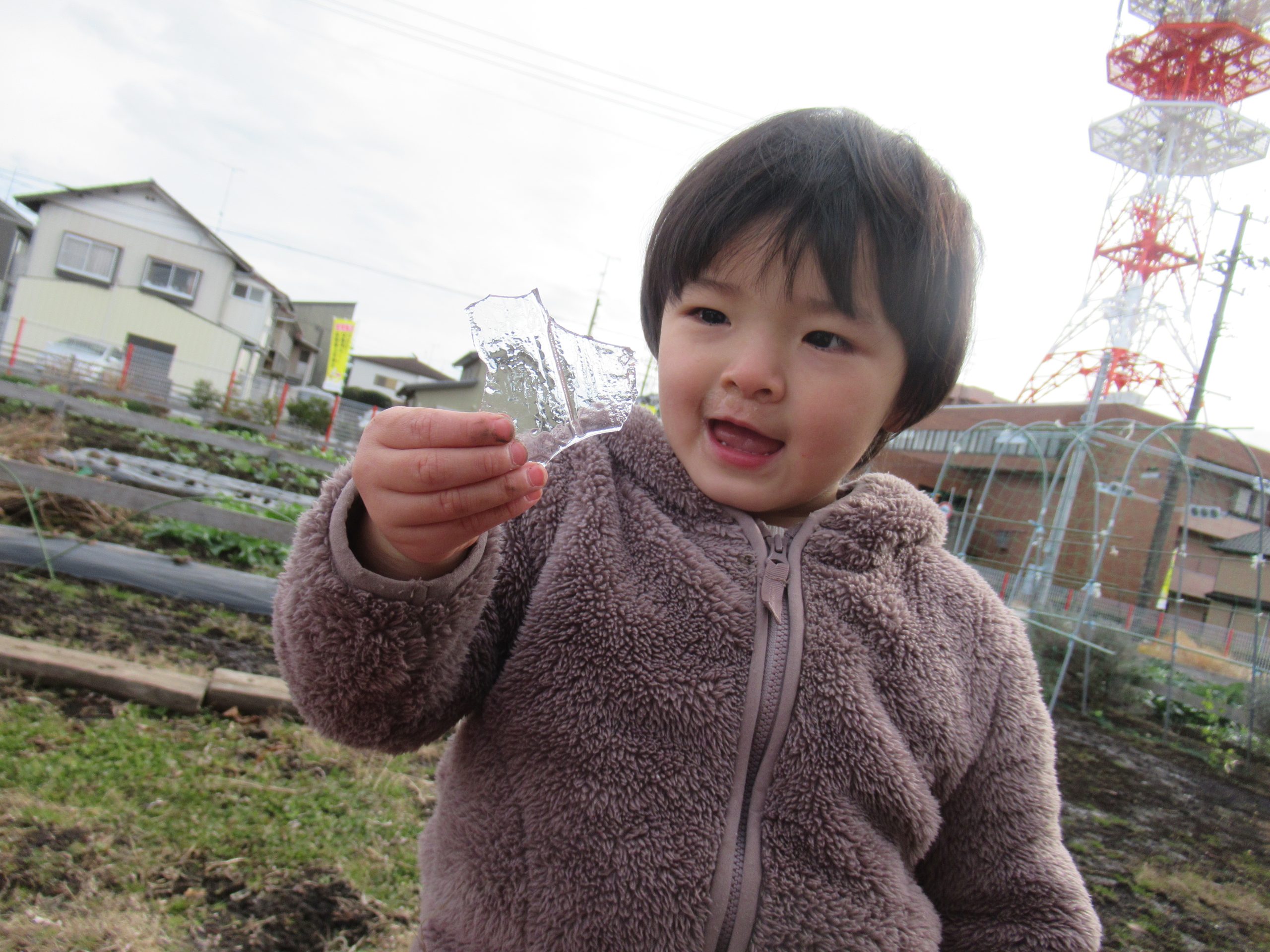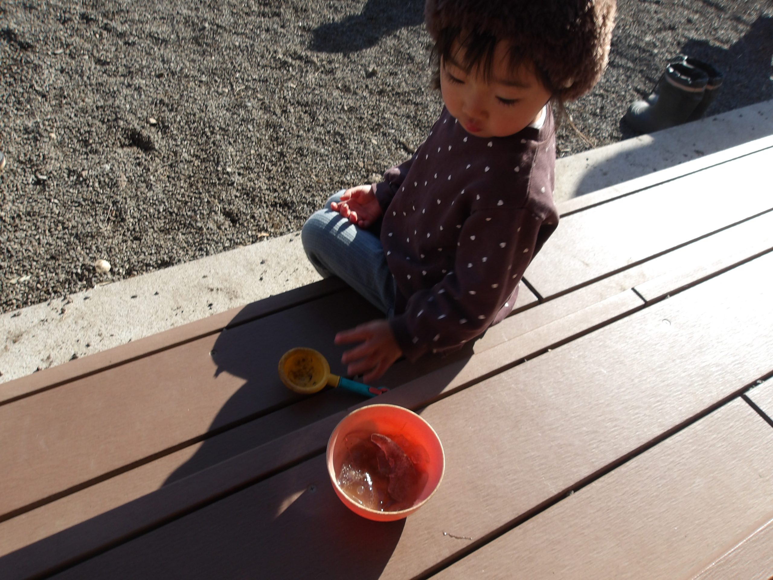 「あっ こおり!」Aちゃんが氷を見つけました。今朝は寒い朝でしたので、外の玩具のお茶碗に偶然に残っていた水が凍っていました。今度はもっと大きな氷を作ってみようね。