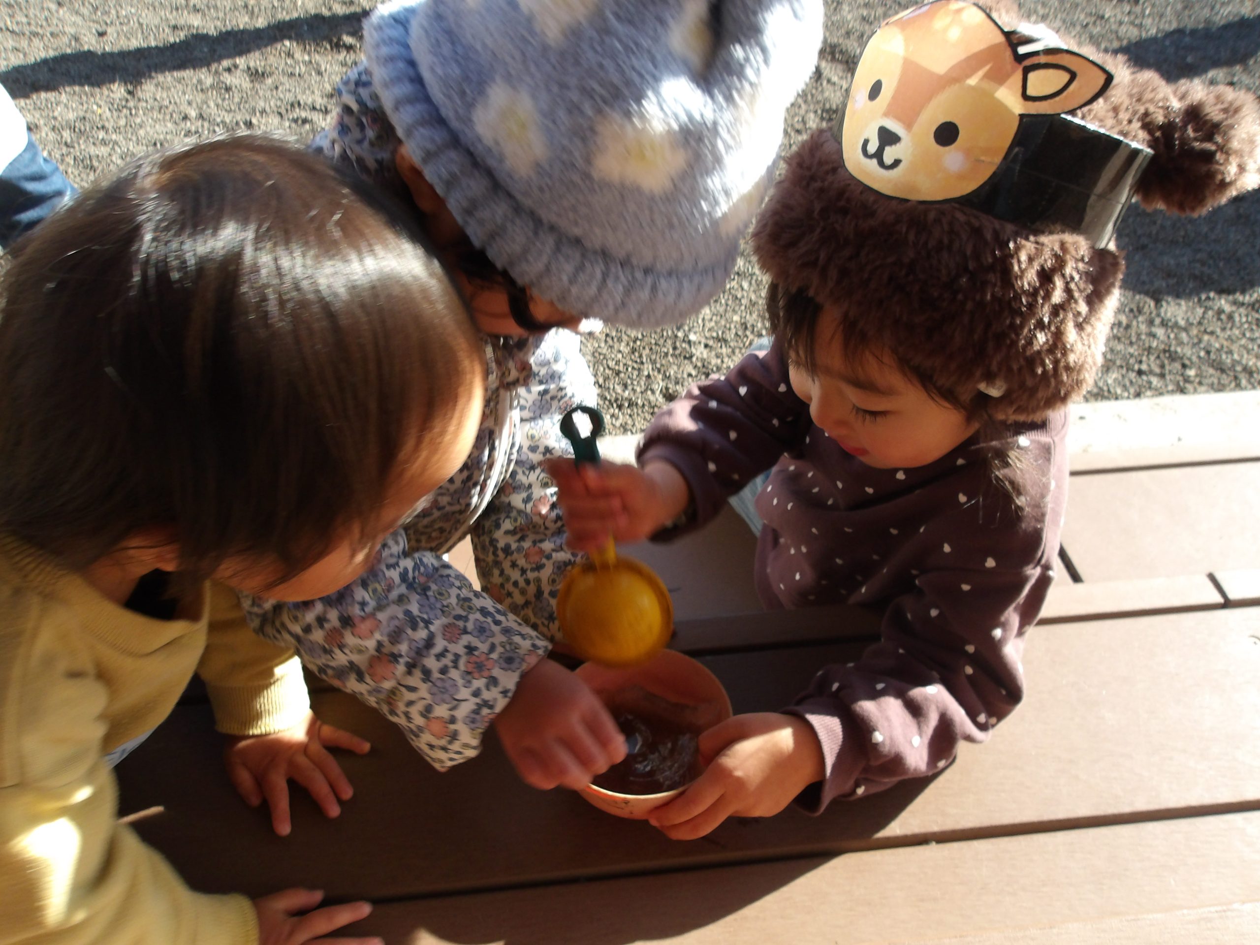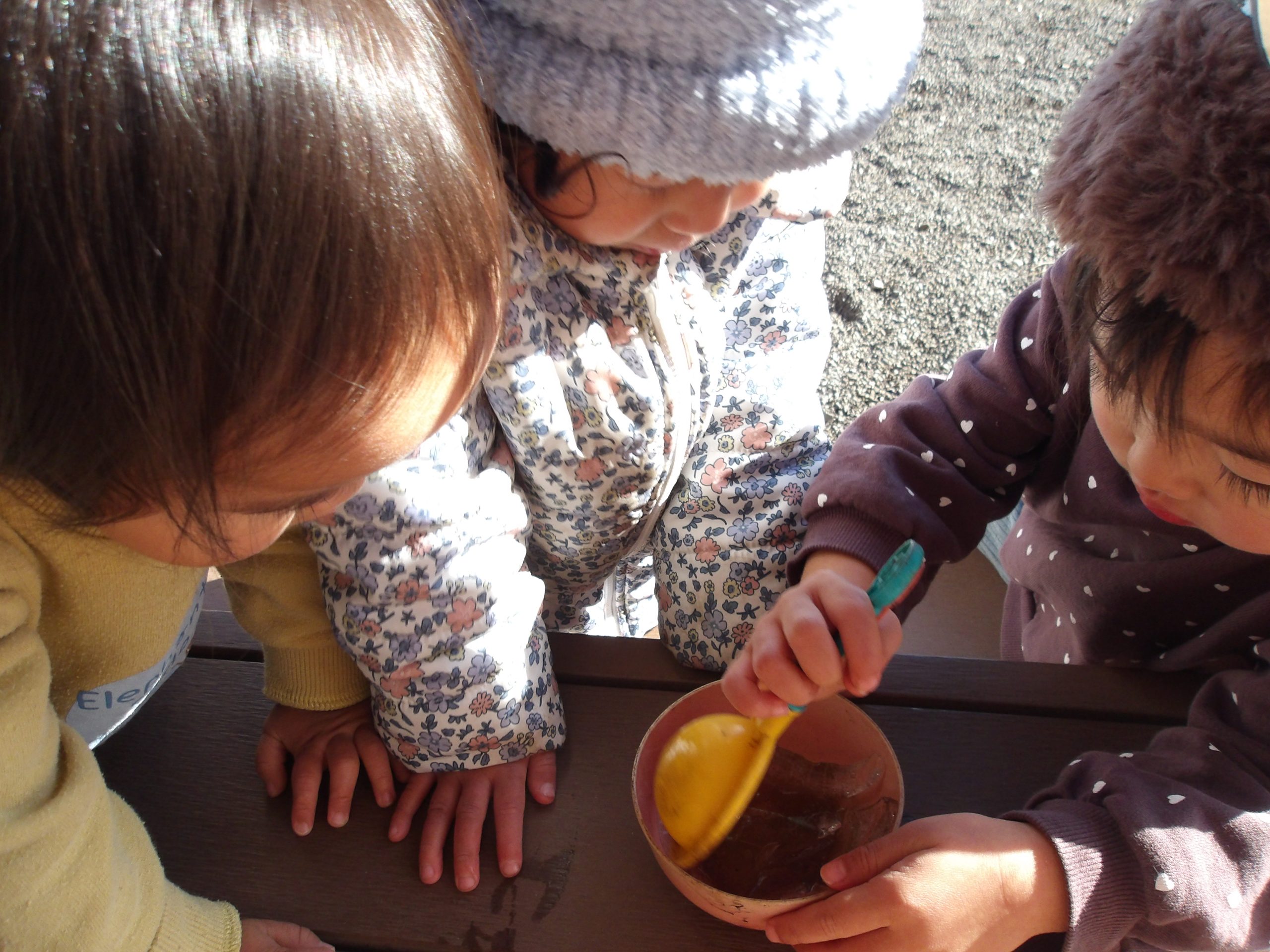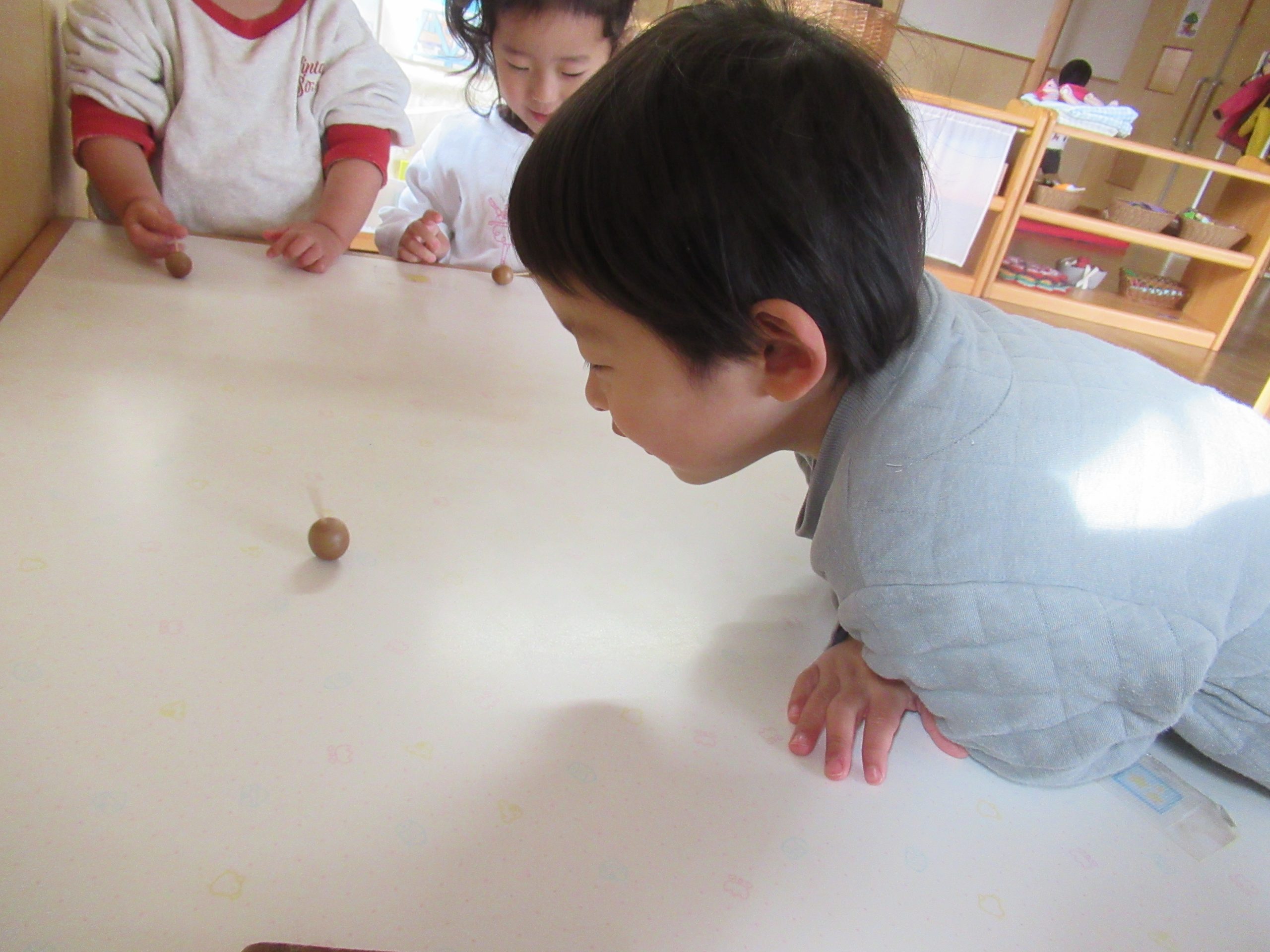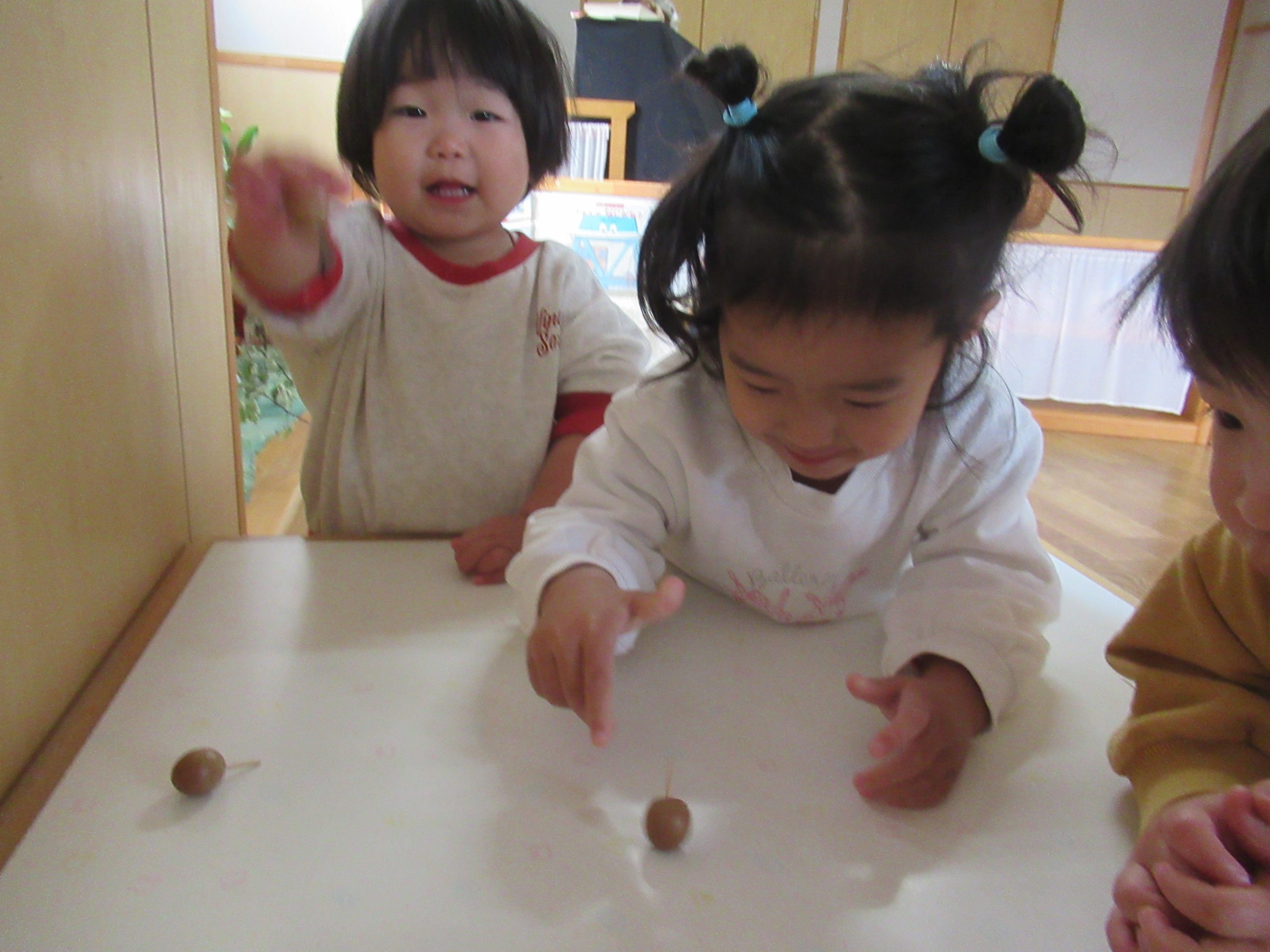 “どんぐり”知ってるよ!えっ棒が・・・。と思って見ていたらひっくり返ってもよく回ってくれるどんぐりゴマ。先生の手元を見て真似てみるけど、ひっくり返ってしまう。それでも回るコマをくい入るようにみていました。お外では氷作りに挑戦。氷は出来ていましたが、先生はもっと厚い氷になって欲しかった、とちょっとがっかりでしたが、子どもは冷たい不思議なものを手に、まじまじと見つめていました。