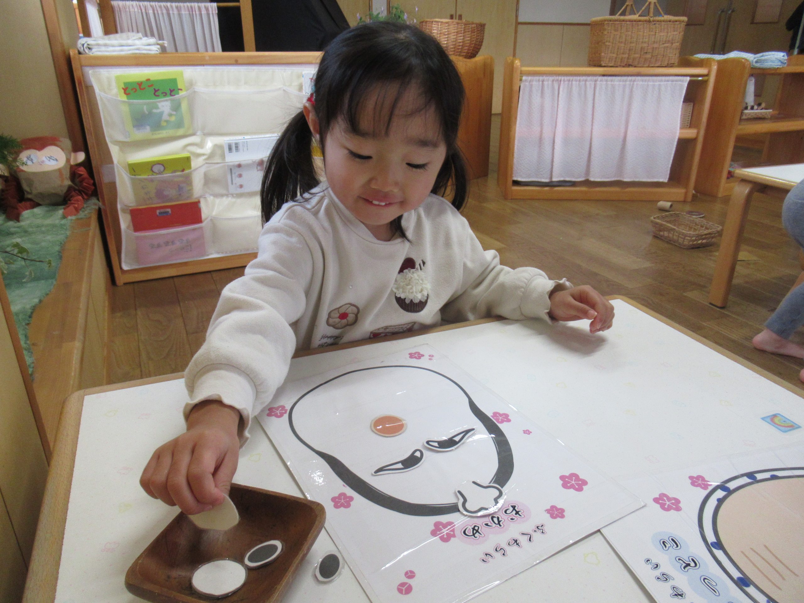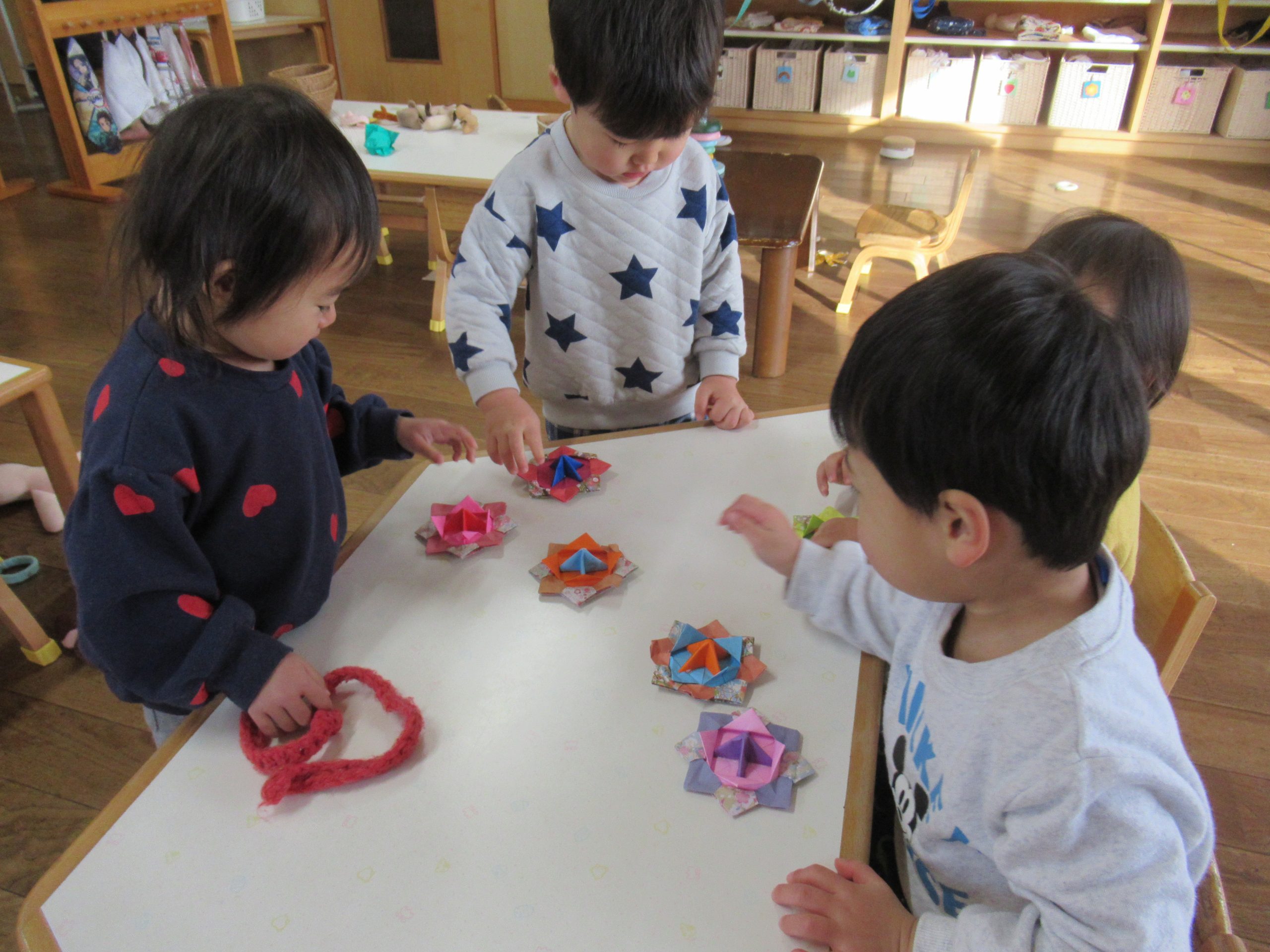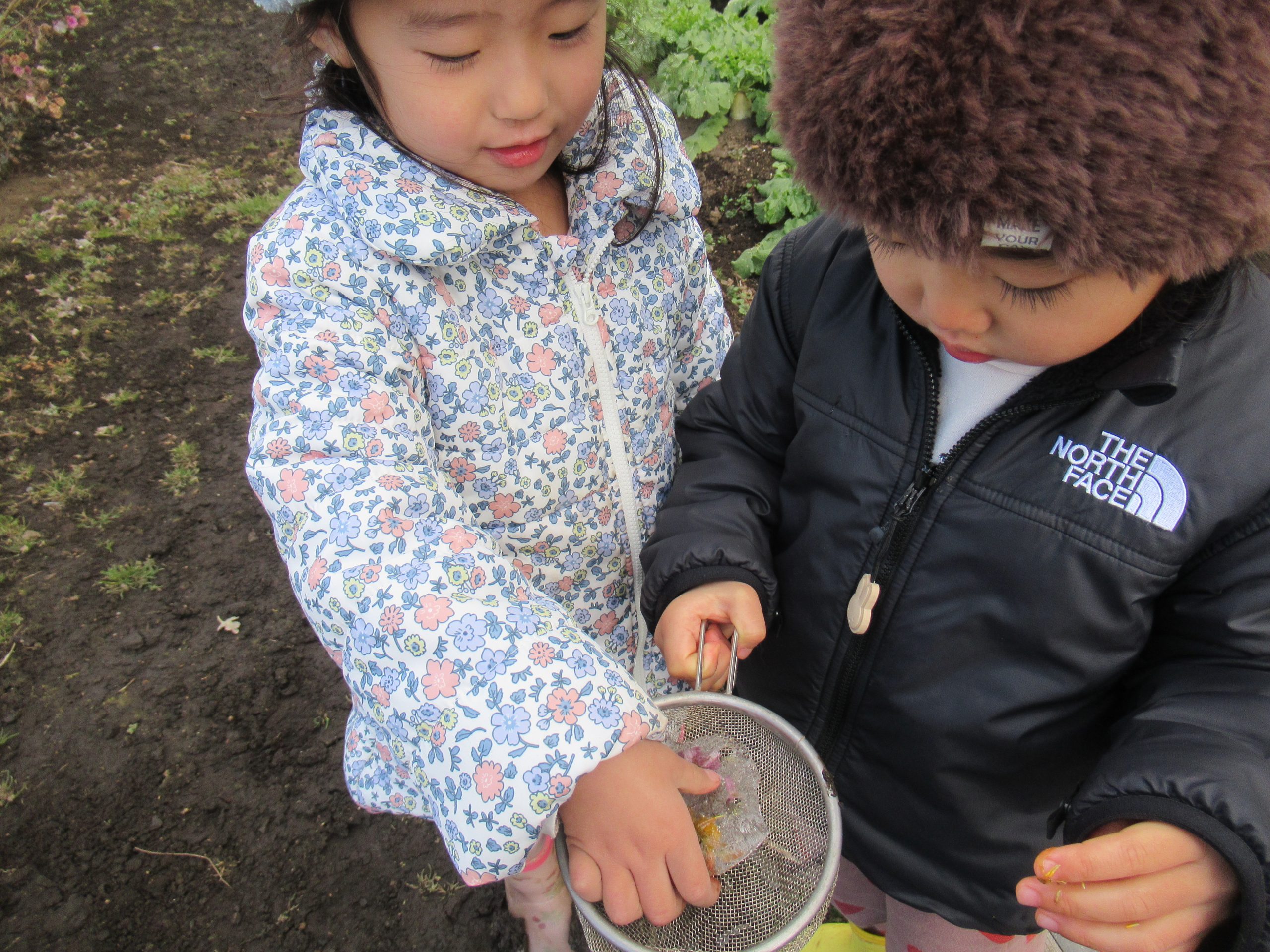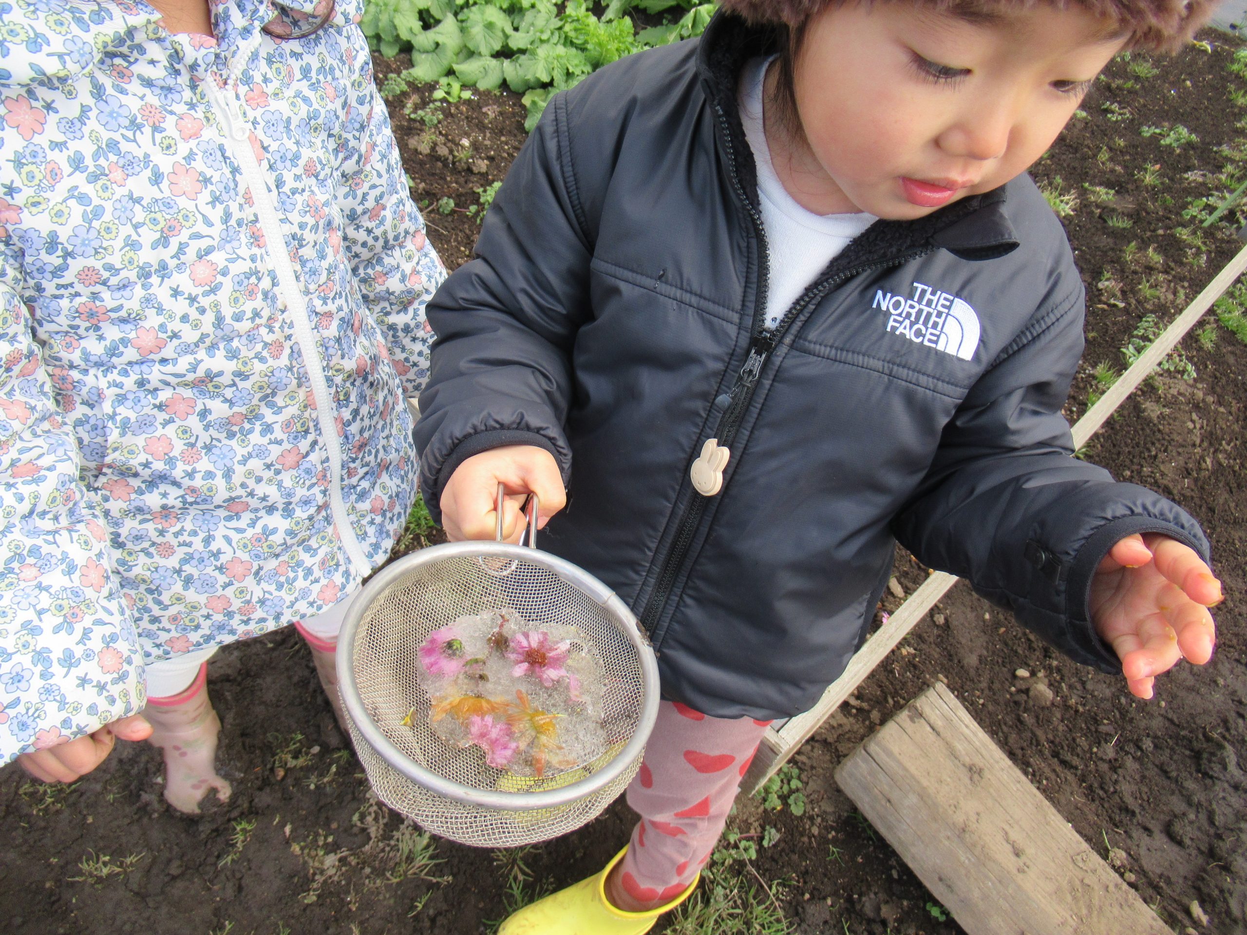 “どんぐり”知ってるよ!えっ棒が・・・。と思って見ていたらひっくり返ってもよく回ってくれるどんぐりゴマ。先生の手元を見て真似てみるけど、ひっくり返ってしまう。それでも回るコマをくい入るようにみていました。お外では氷作りに挑戦。氷は出来ていましたが、先生はもっと厚い氷になって欲しかった、とちょっとがっかりでしたが、子どもは冷たい不思議なものを手に、まじまじと見つめていました。