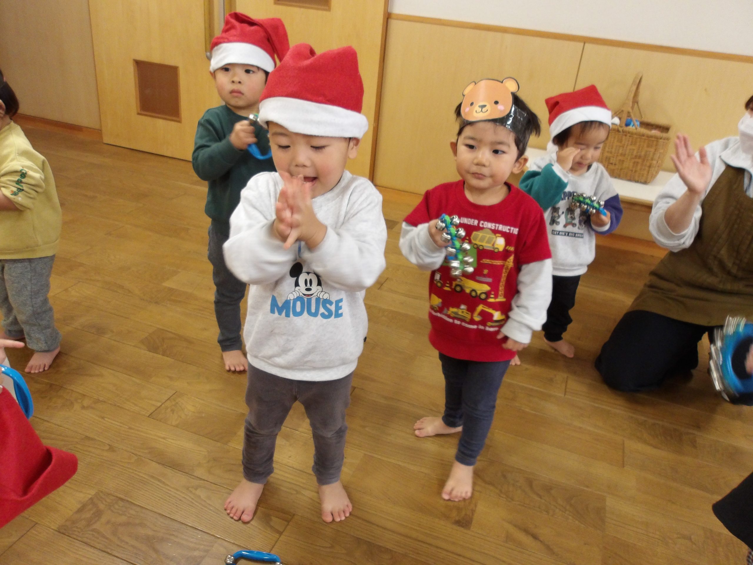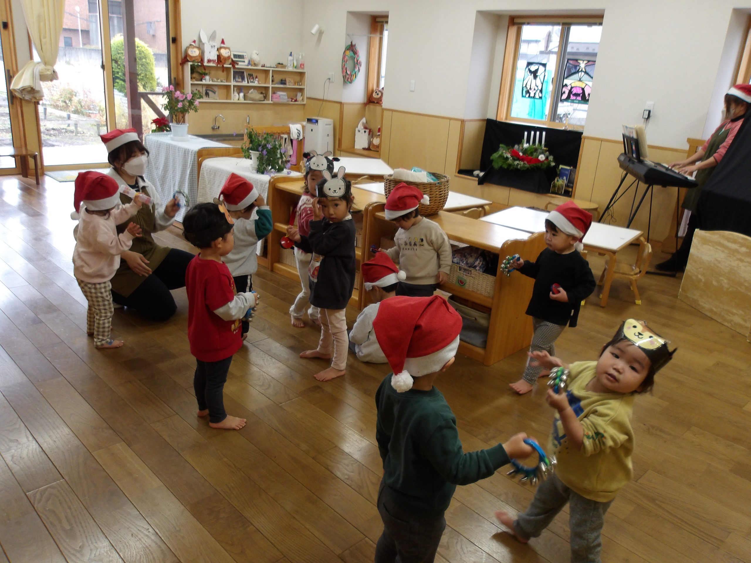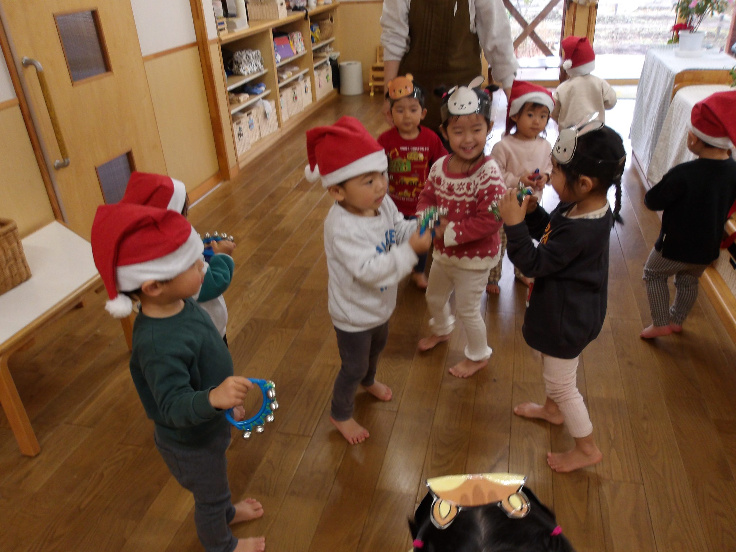 聖誕劇の歌やあわてんぼうのサンタクロースの歌が、この頃はすっかい自分の歌になっているようで、子どもたちは遊んでいる時でもよく口ずさんでいます。今日はクリスマスイブ。森の動物やサンタさんになって、ピアノに併せて楽器を鳴らしてあそびました。