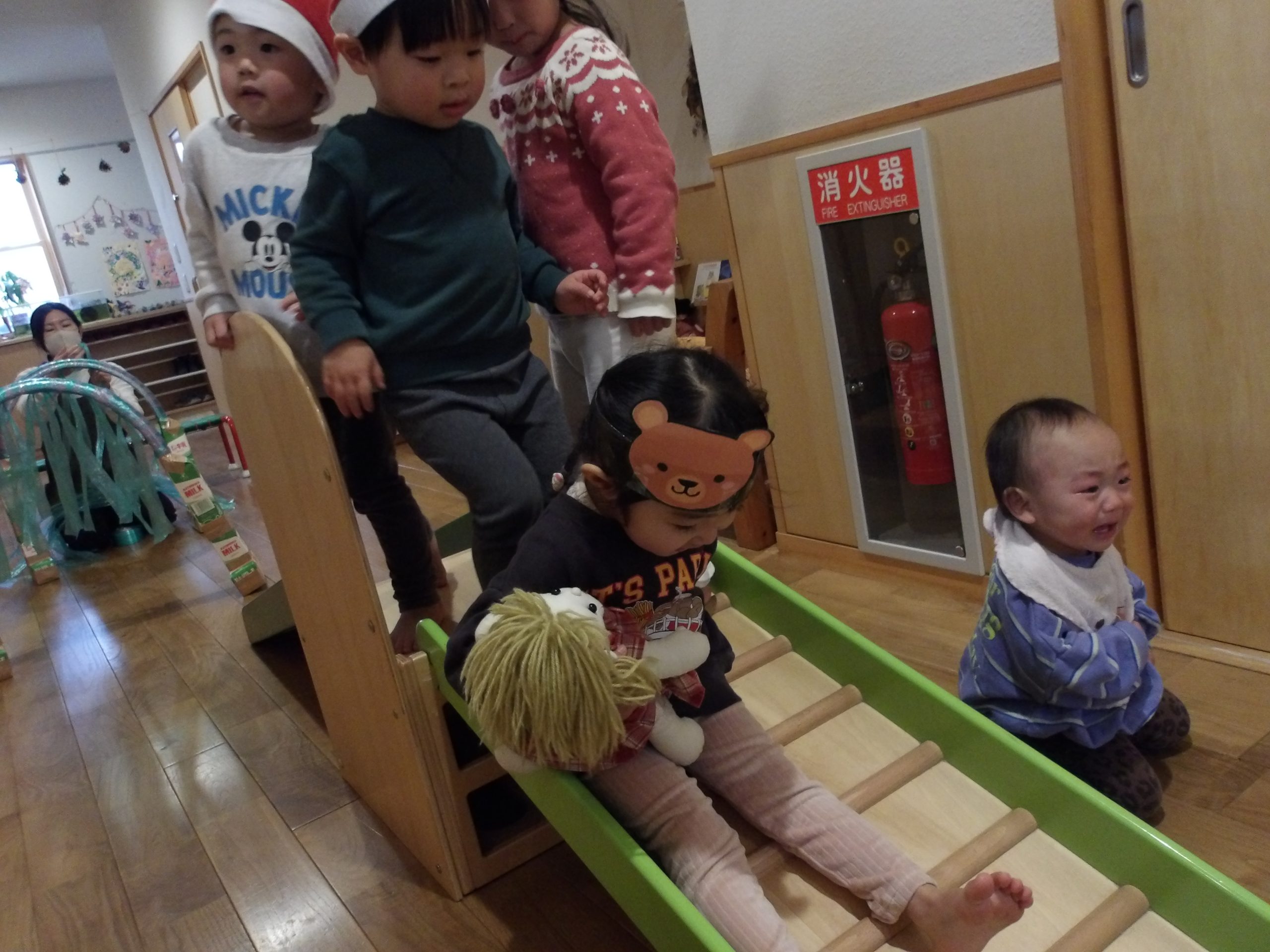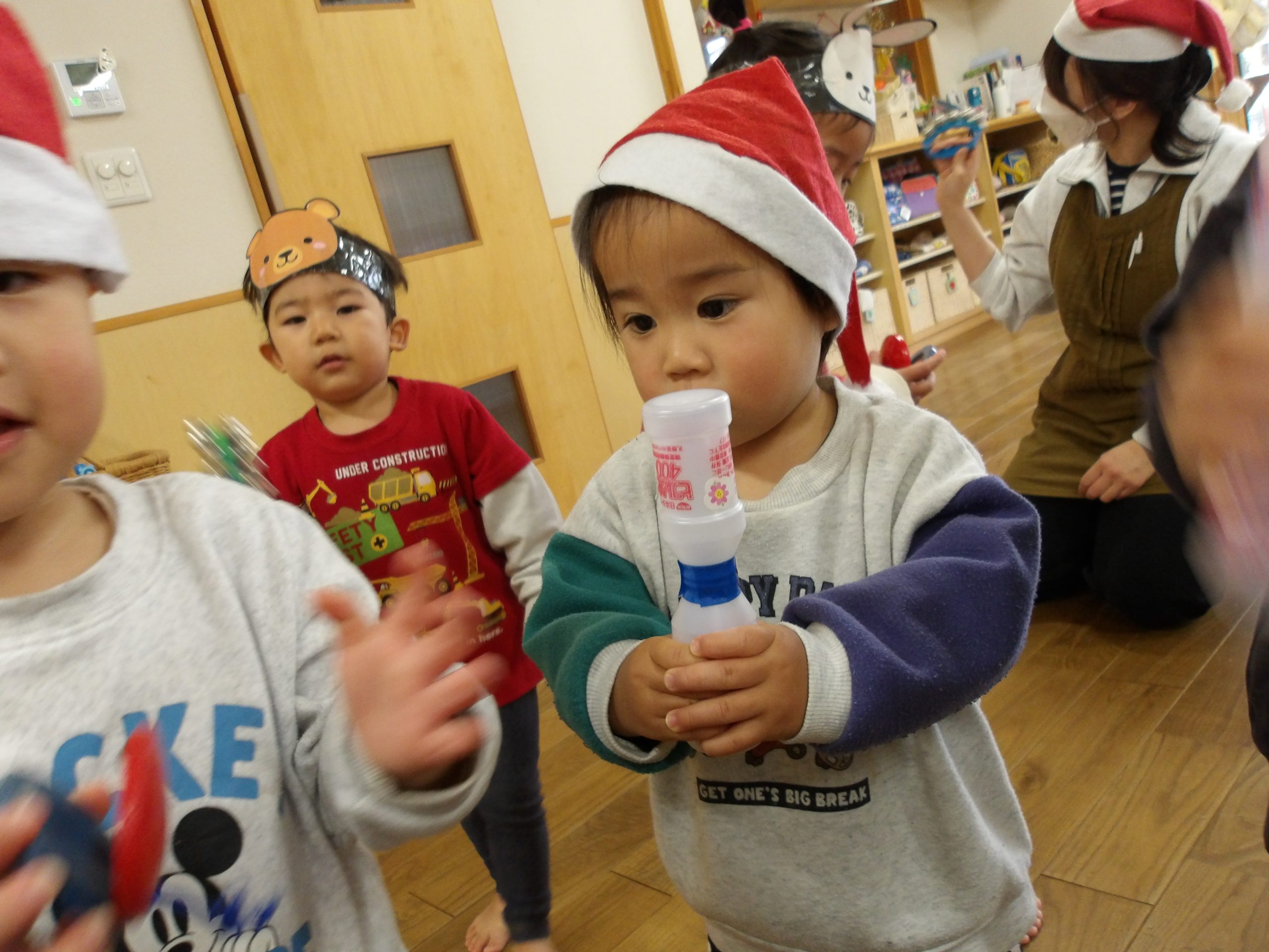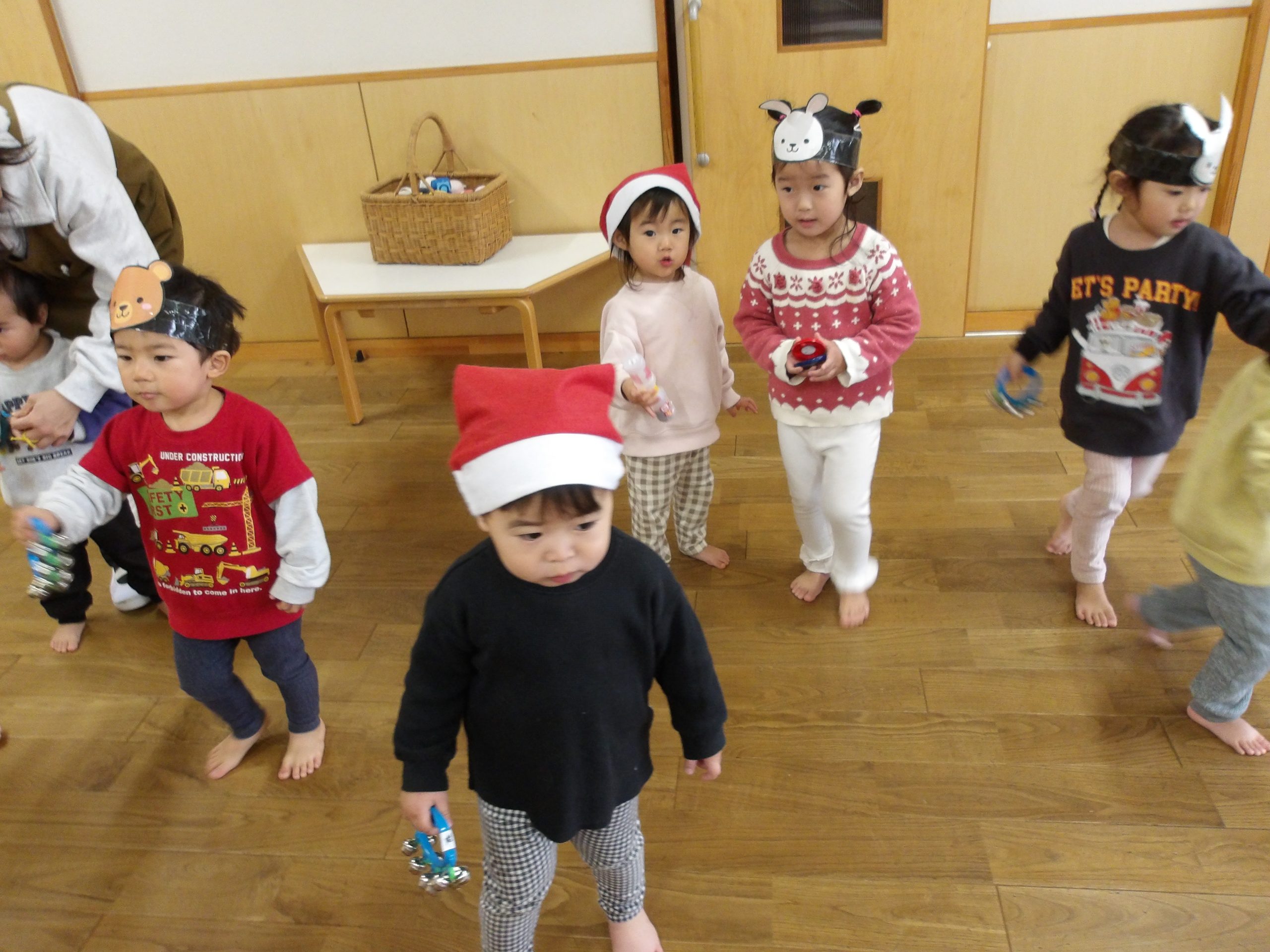 聖誕劇の歌やあわてんぼうのサンタクロースの歌が、この頃はすっかい自分の歌になっているようで、子どもたちは遊んでいる時でもよく口ずさんでいます。今日はクリスマスイブ。森の動物やサンタさんになって、ピアノに併せて楽器を鳴らしてあそびました。