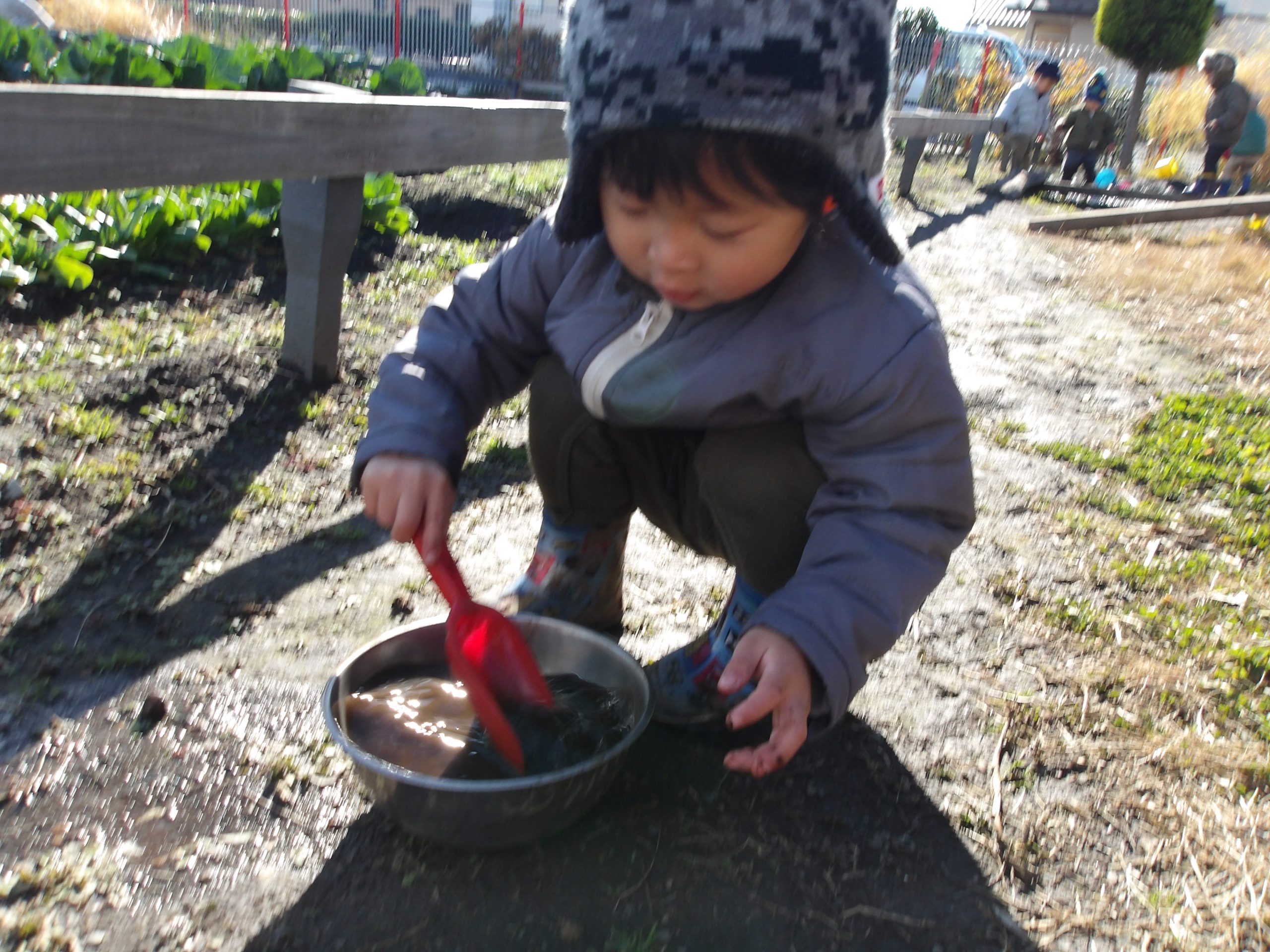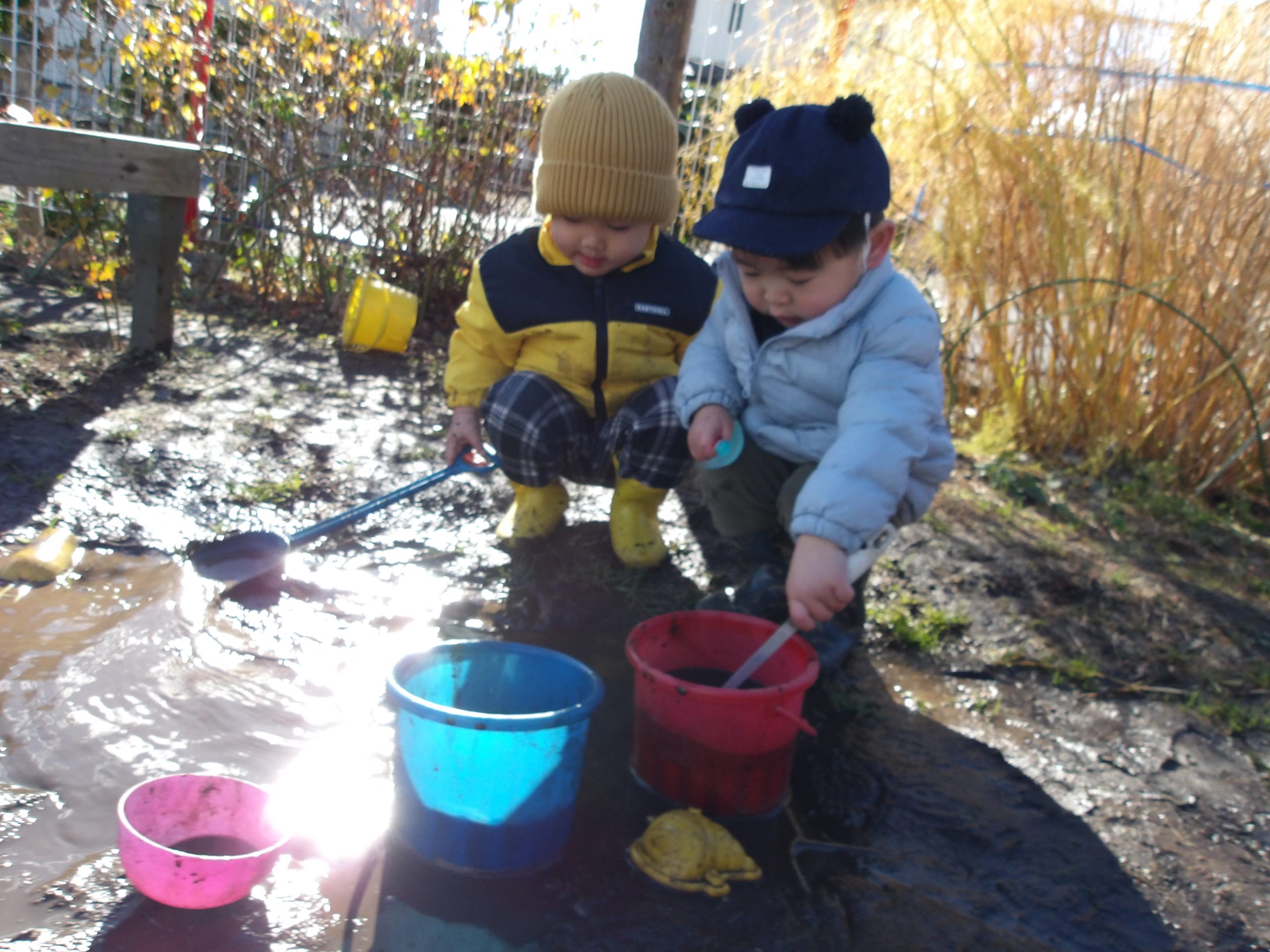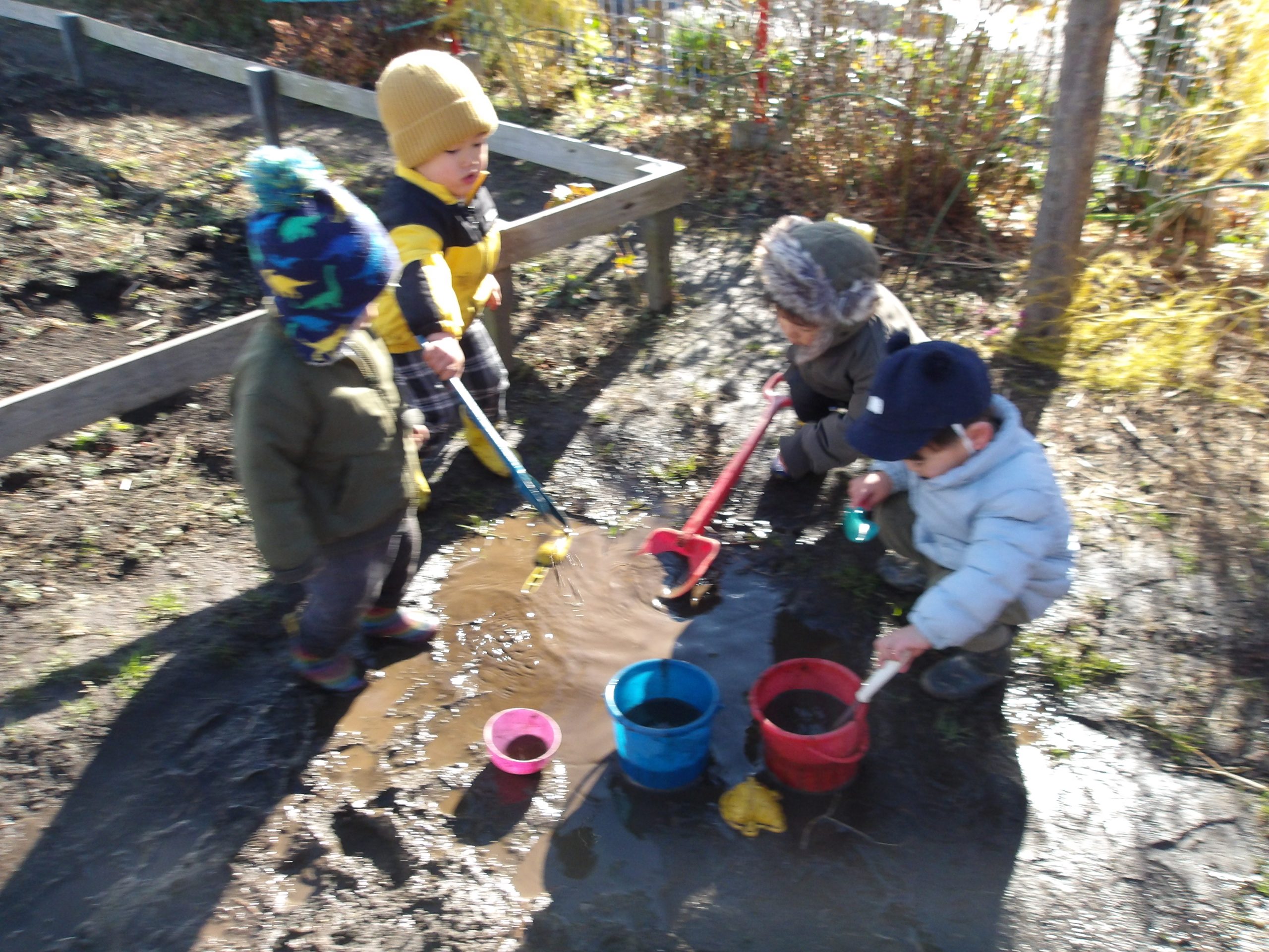 今年最後の泥んこ遊び。しばらくぶりの雨降りで、外に出ると早速泥んこに集まった子どもたち。さすがに寒さを感じたのか、濡れないようにしながらおもちゃを使って遊んでいました。皆さん良いお年をお迎えください。