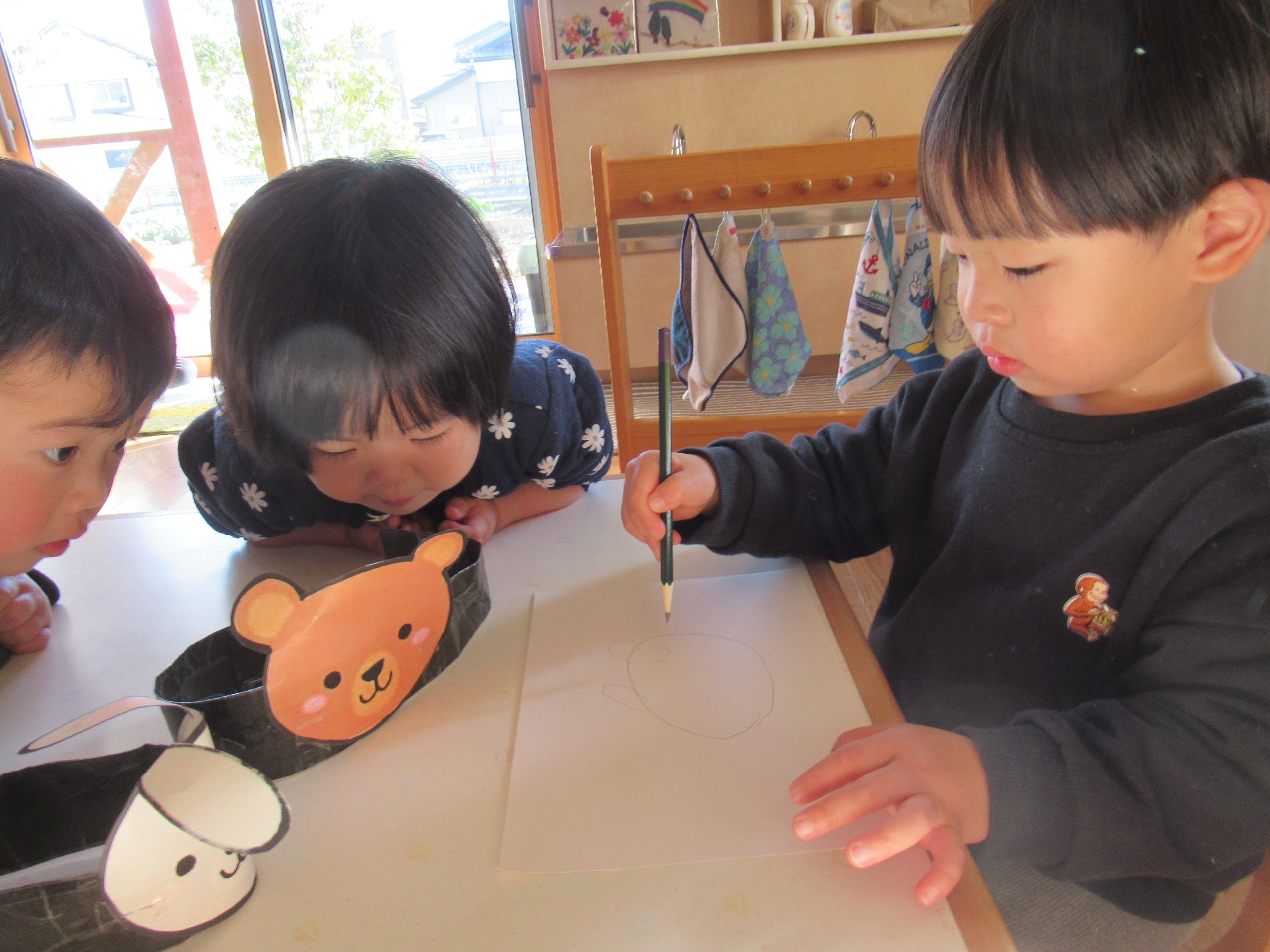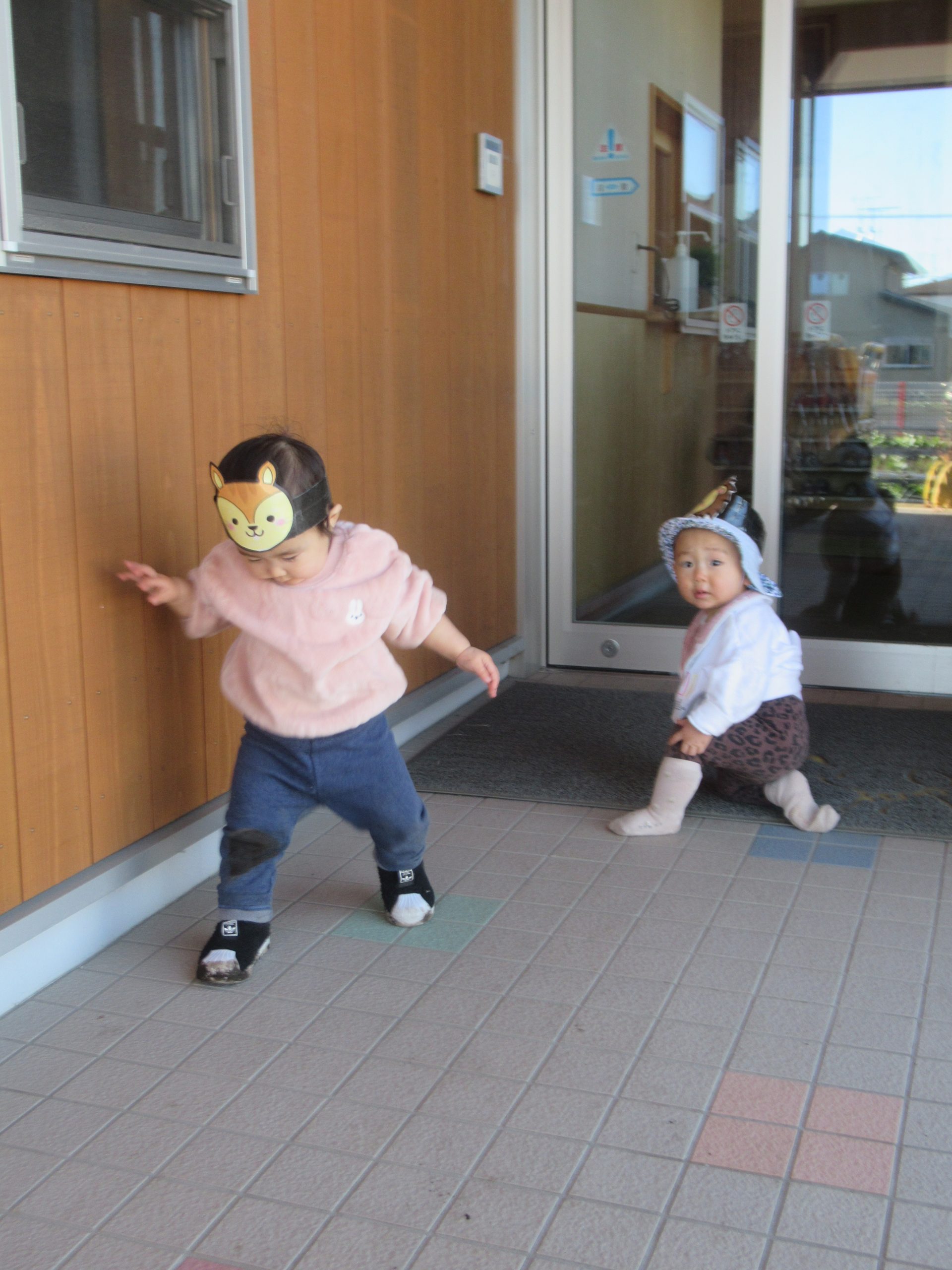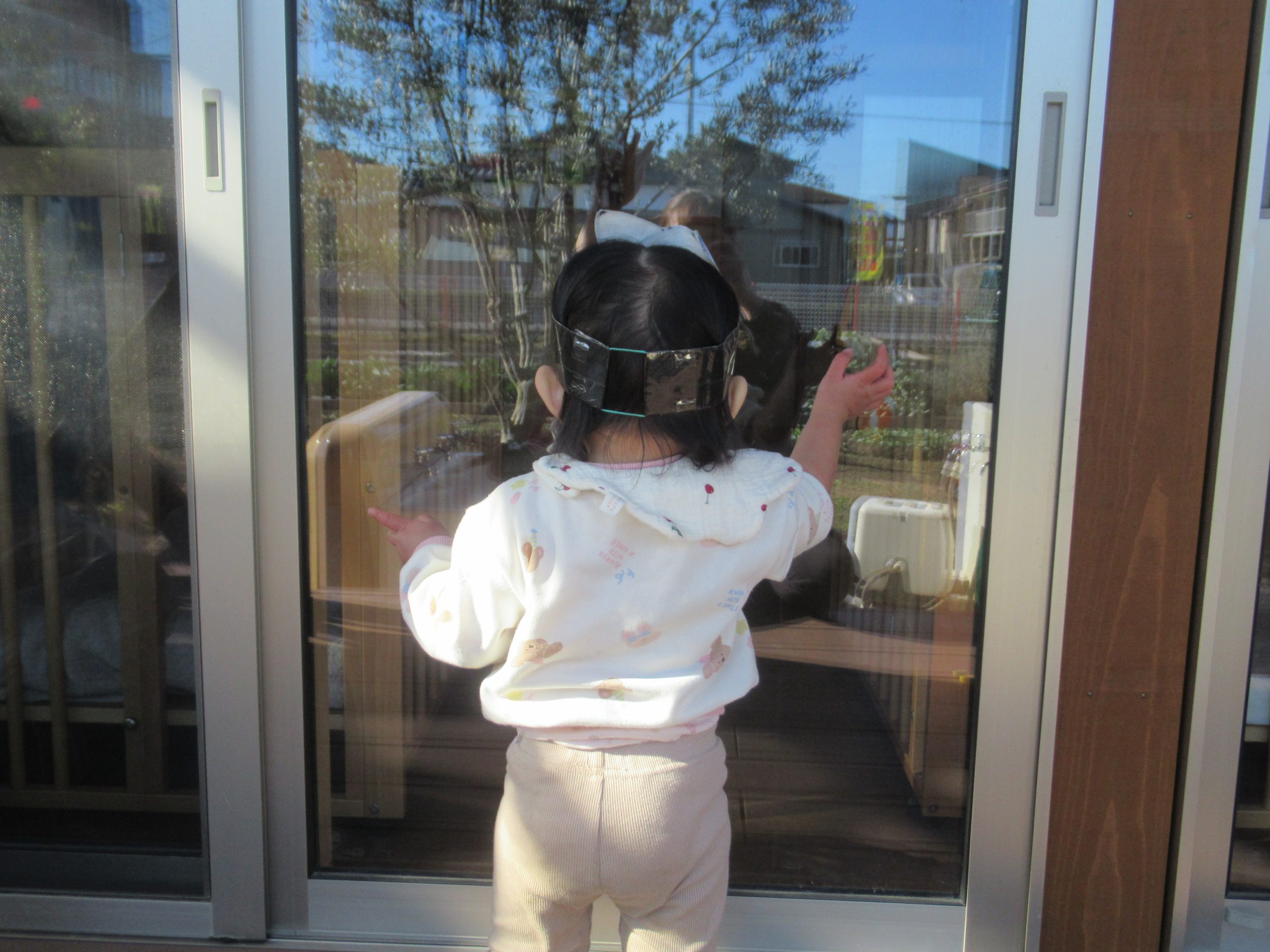 動物村の動物になって遊びました。ことり組さんも喜んでお面を被って遊びだしたのですが、ことり組同士で自然に集まってきます。「ねぇねぇこれ」とか「あっまってー」など言葉が聞こえてきそうです。言葉は交わさなくても通じ合っていることり組さんたちです。窓ガラスに映った自分の姿がお友だちに見えたのか、Eちゃんは一所懸命呼びかけているようでした。