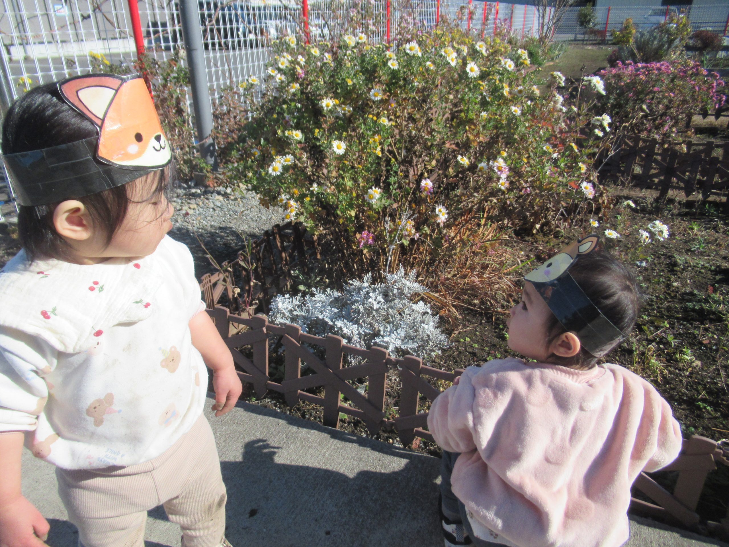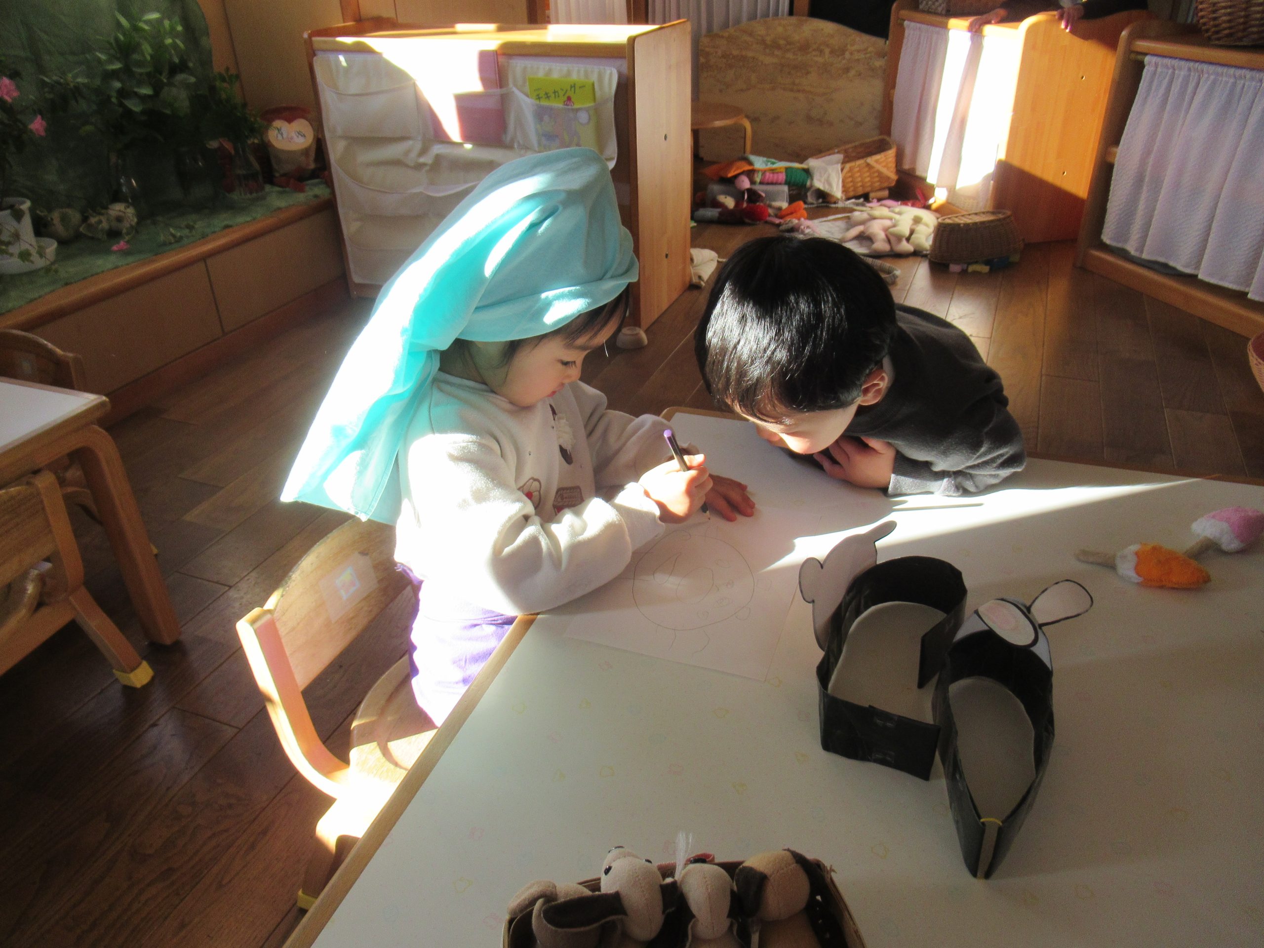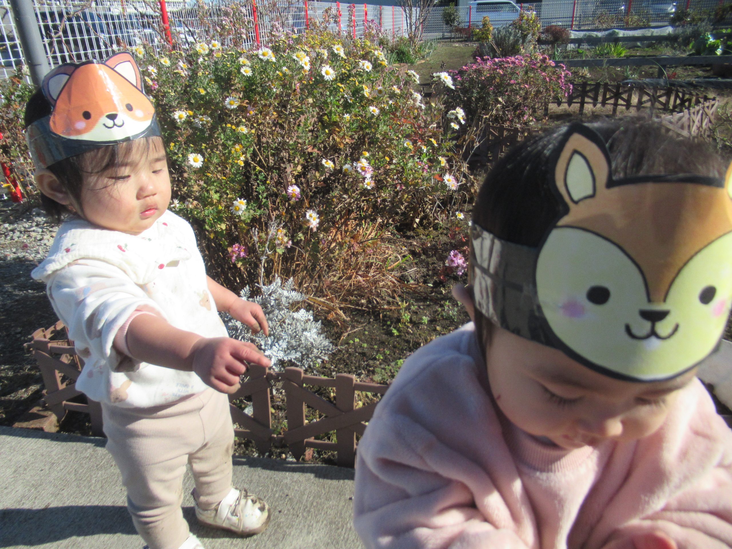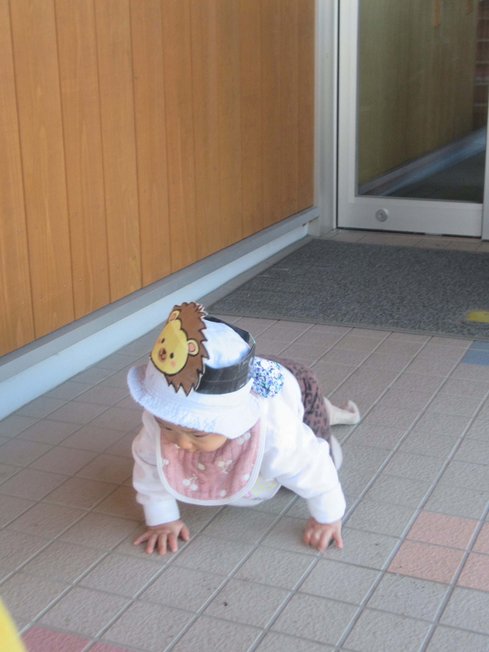 動物村の動物になって遊びました。ことり組さんも喜んでお面を被って遊びだしたのですが、ことり組同士で自然に集まってきます。「ねぇねぇこれ」とか「あっまってー」など言葉が聞こえてきそうです。言葉は交わさなくても通じ合っていることり組さんたちです。窓ガラスに映った自分の姿がお友だちに見えたのか、Eちゃんは一所懸命呼びかけているようでした。