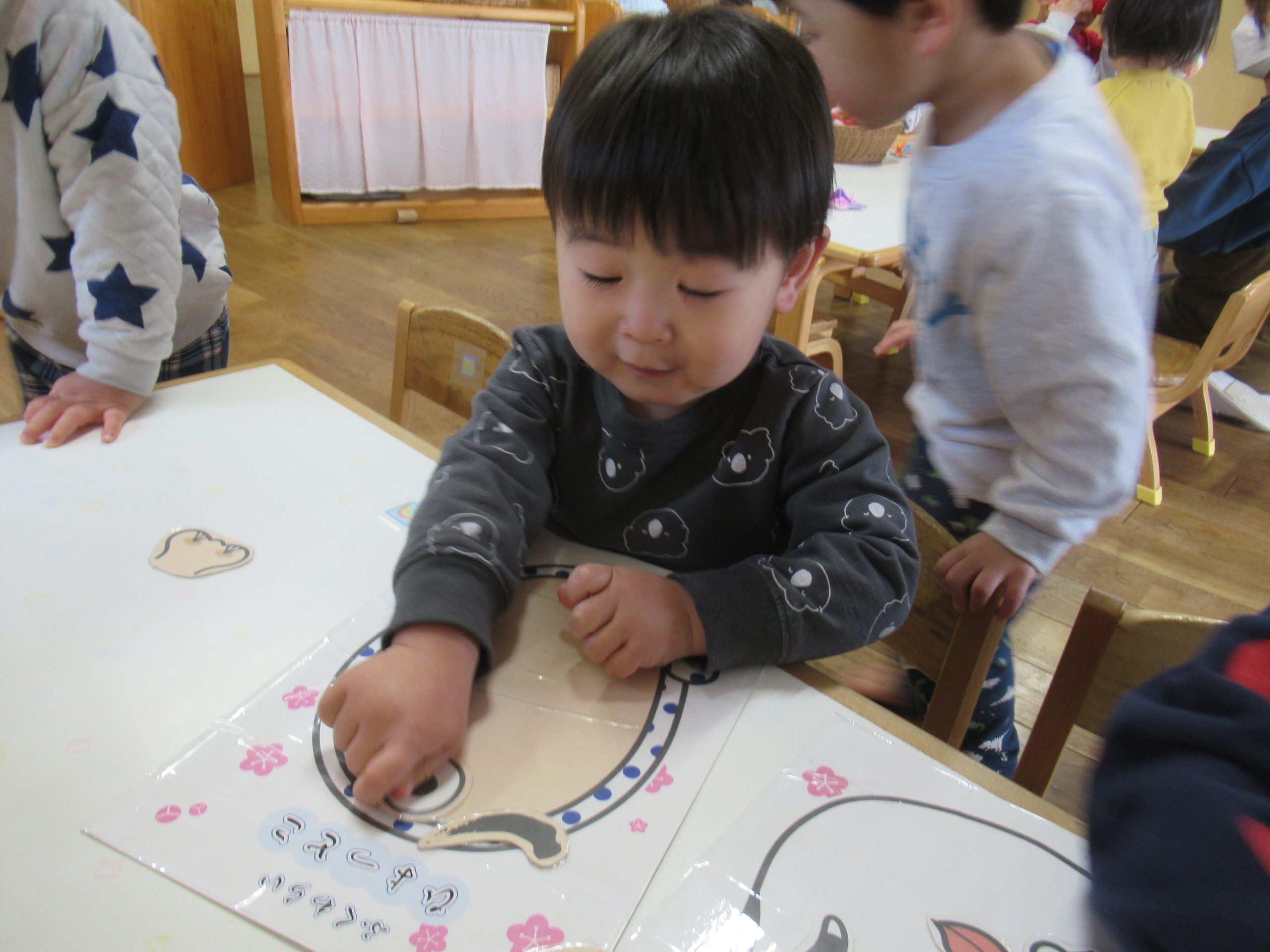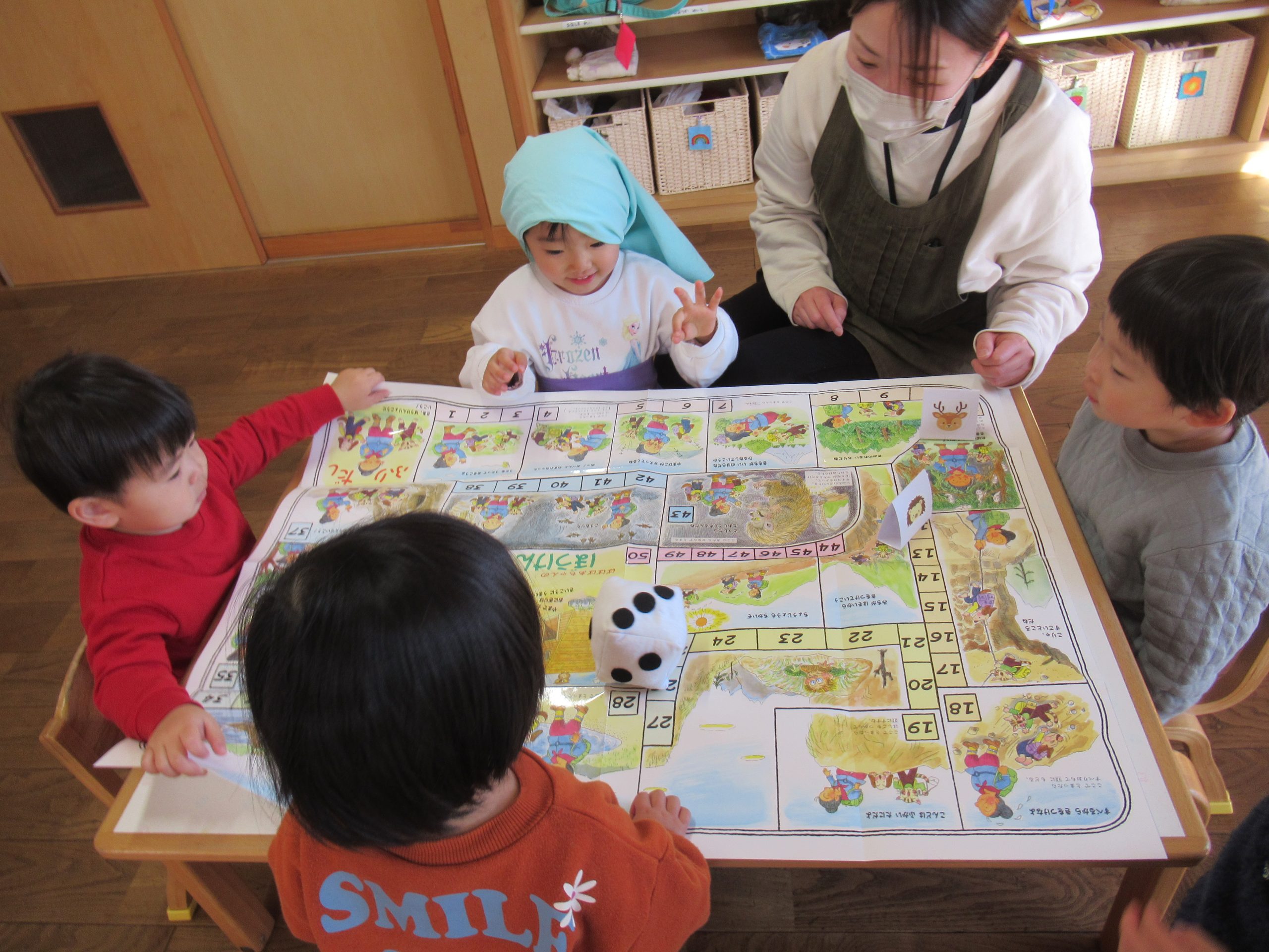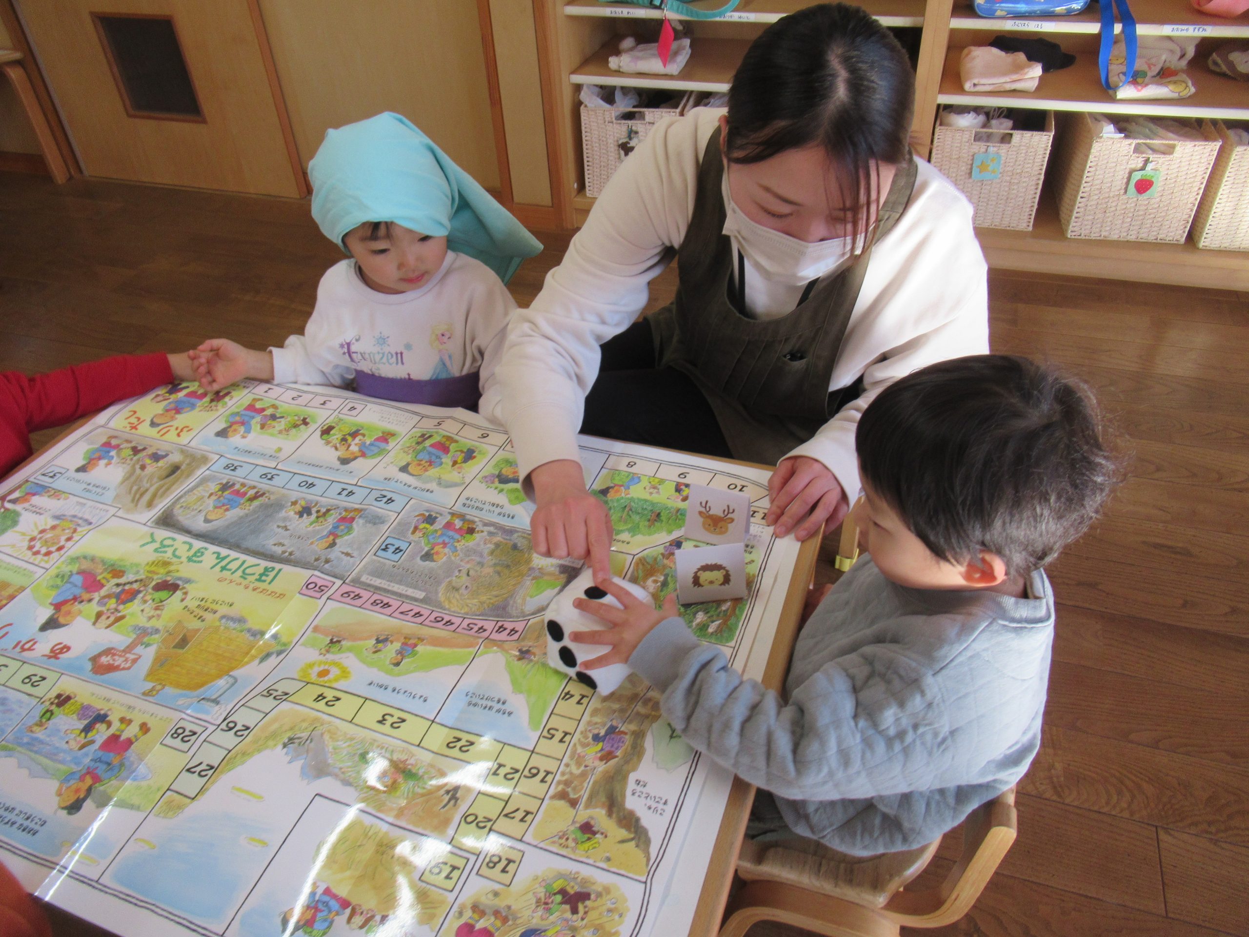 すごろく遊びをしました。振ったさいころの出た目(1~3)の数っだけ進むルールは、ちょっと難しかったですが、さいころを振るのは楽しそう。出た目の数分だけ進むのは、先生がやっているのを真似て言葉では言っています。が、自分の好きな所に好きなようにちょんちょんちょん。と。数え方遊びを楽しみました。
