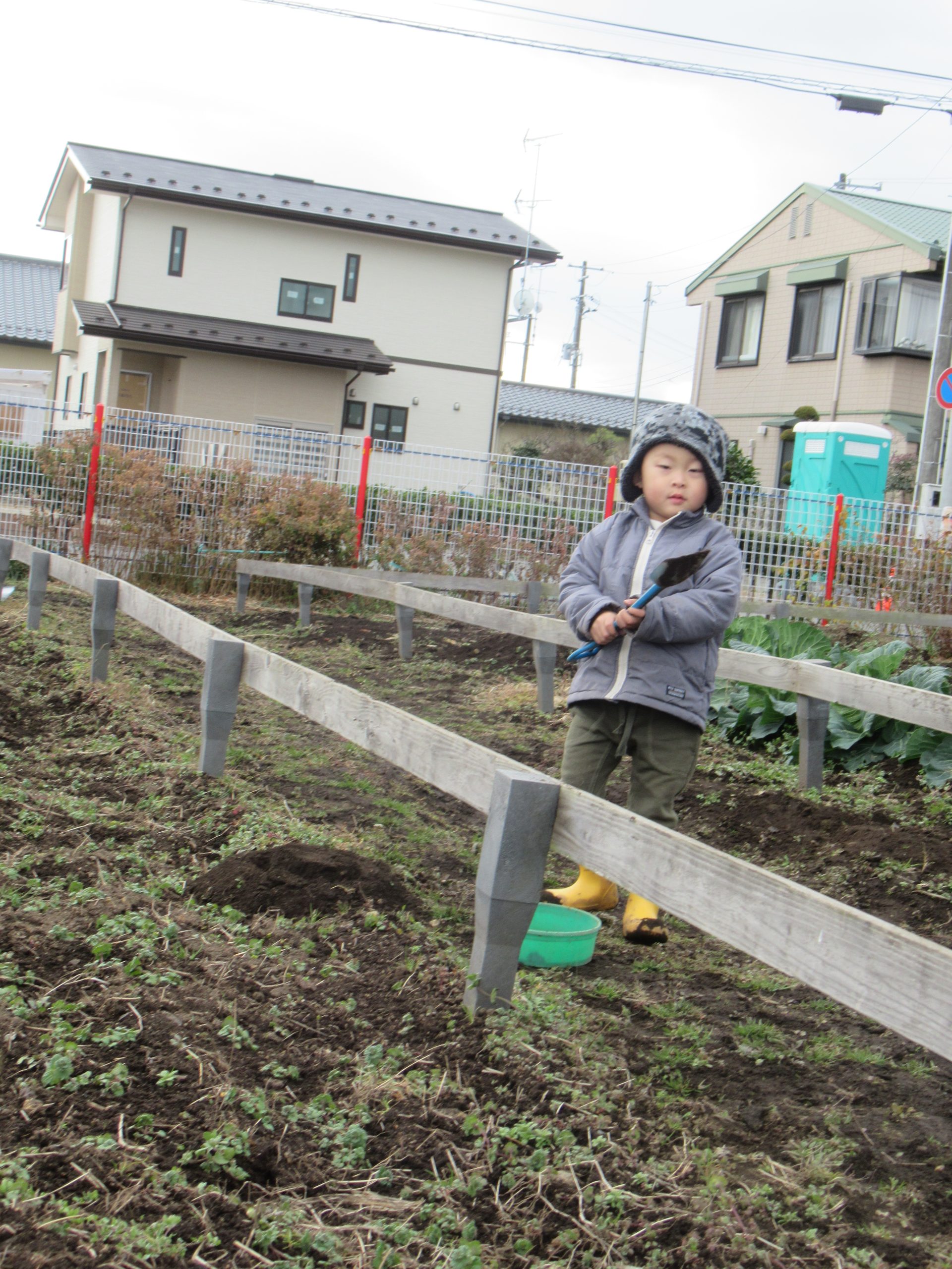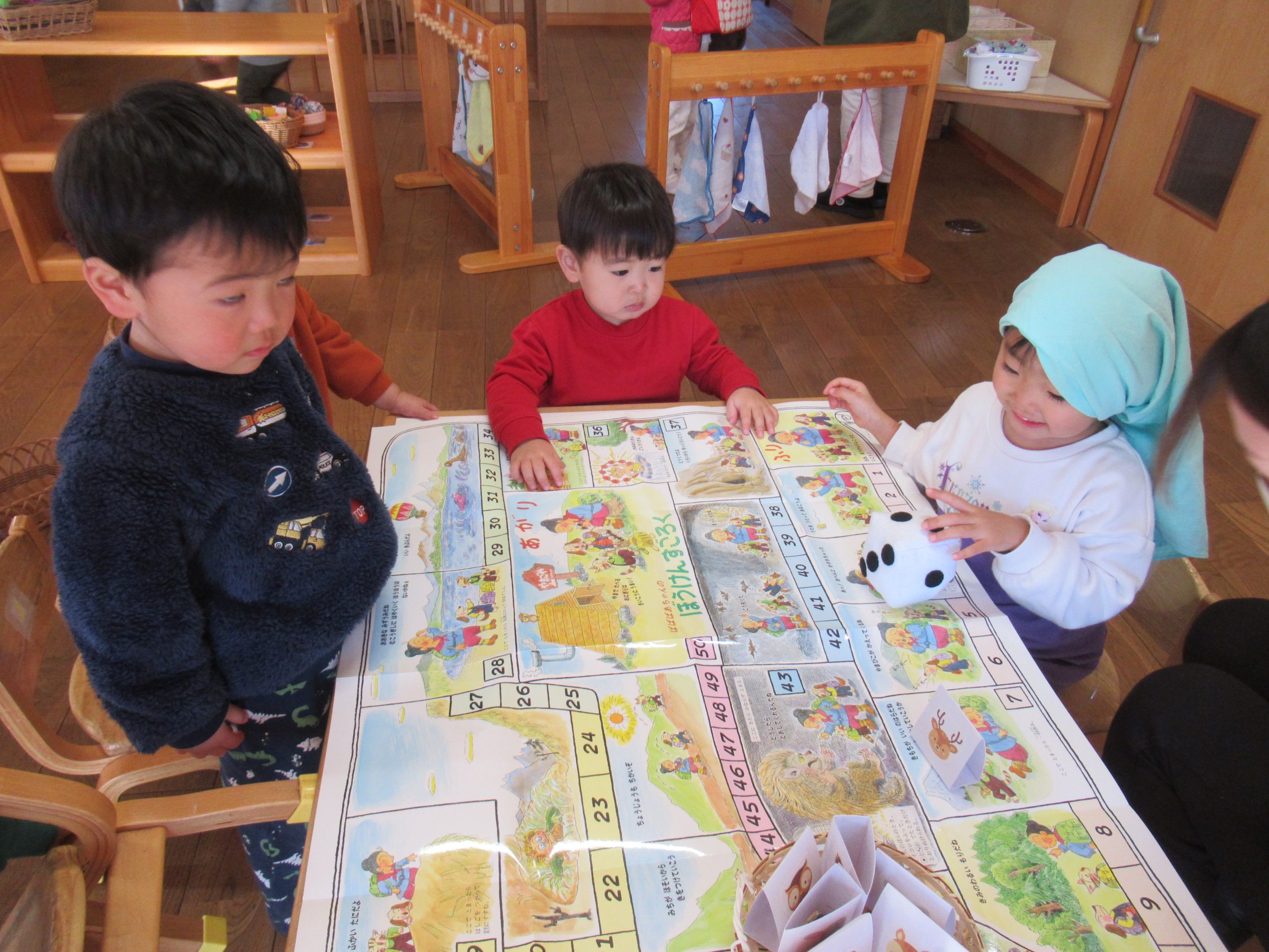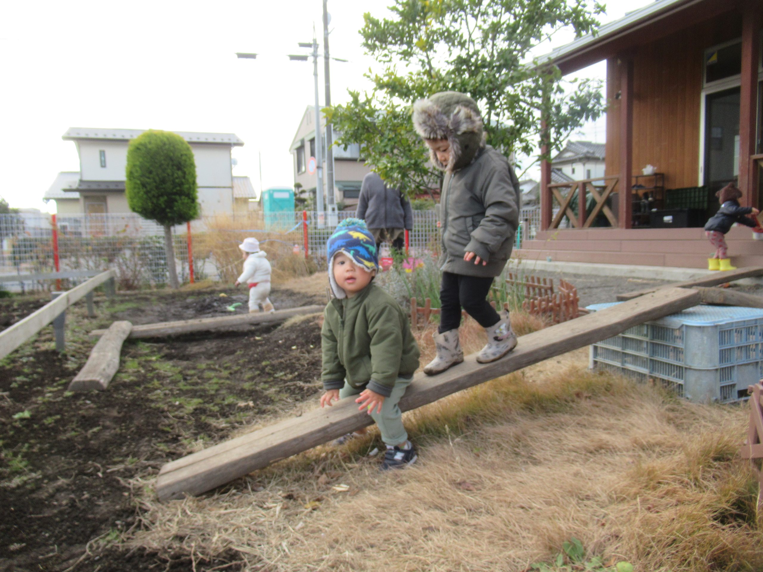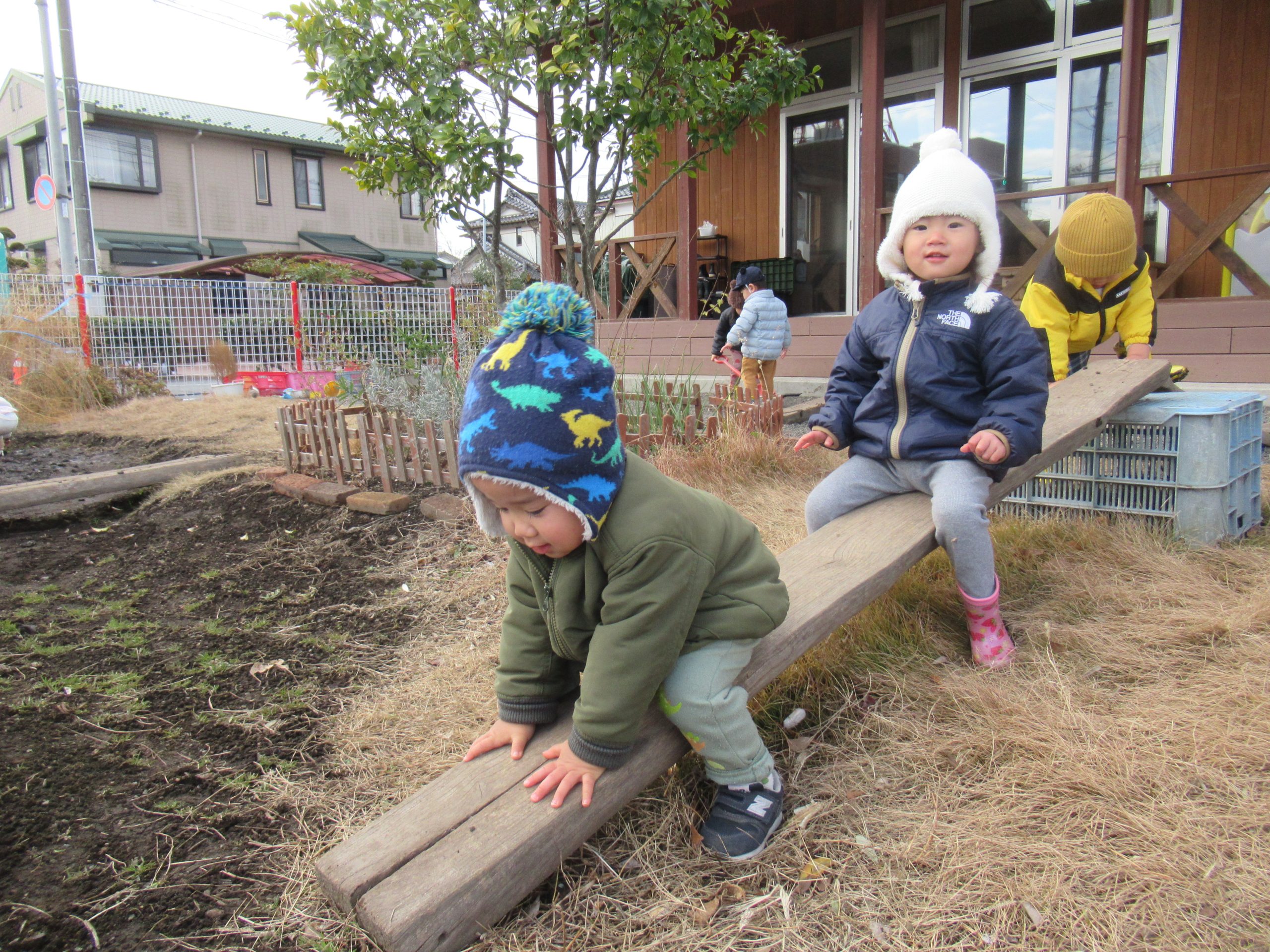 「いっぱいお話しするようになったんです。」と玄関でママが嬉しそうにお話しするのをきいて嬉しそうなH君。入室すると自ら先生に挨拶をしていました。新年の挨拶をしながら元気に登園したはな組さんをはじめ、みんな暫くぶりの登園。泣いてしまうこともありましたが、室内のお正月遊びの後は、ぬかるむ畑を駆け回って“ちいろば生活”をスタートしました。今年もよろしくお願いいたします(*^^)v